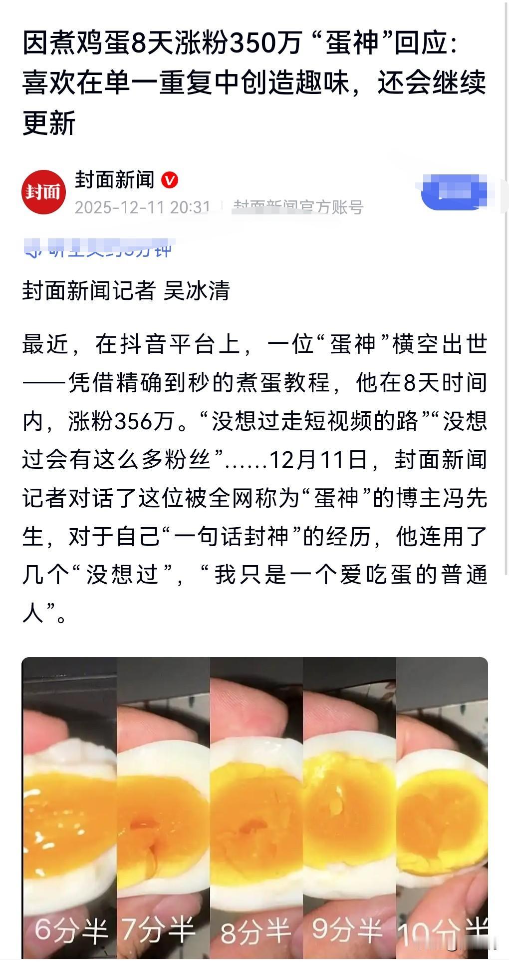 这真是超出了我的认知。 一个煮鸡蛋煮的好的人,短短几天,从2000粉丝涨到了300多万。 互联网就是这么的不可思议。 不过这个人确实对鸡蛋非常的有研究,煮多久会形成什么样的状态?他都了然于胸。 没有人能随随便便成功啊。 再加上媒体的推波助澜,他想不火都难啊。 从此走上了人生巅峰。一个网红又横空出世。 厉害了。