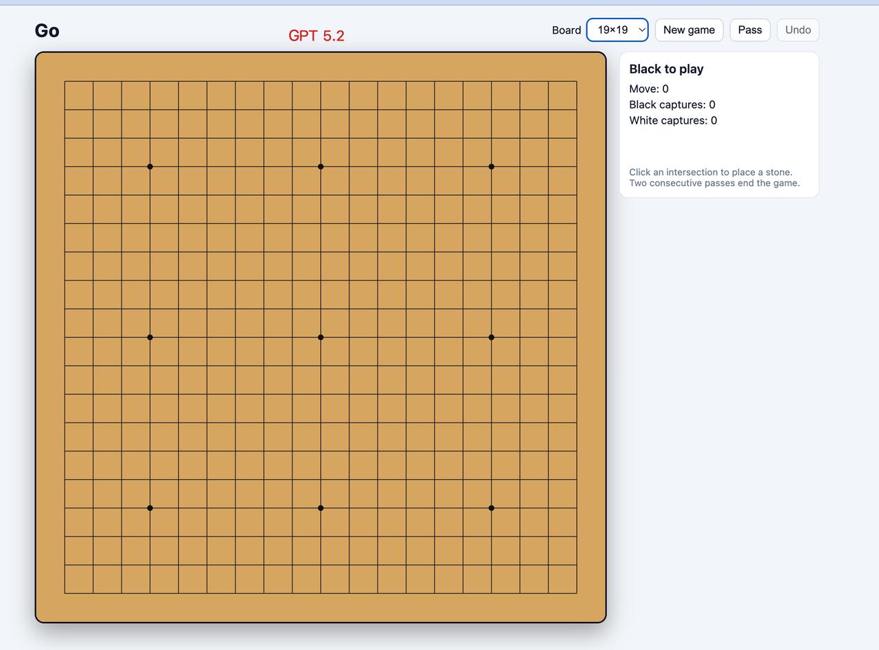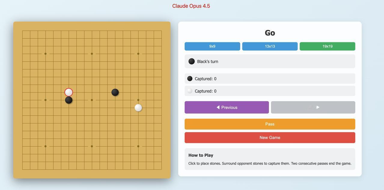 让三家目前地表最强的AI(Claude Opus 4.5, GPT 5.2, Gemini 3 Pro)给我生成的围棋游戏,都是用HTML写的。 第一个是我觉得页面最好看的是 Claude Opus 4.5 生成的,当然,一开始背景是黑色的,我让他调亮点,整体效果不错。Claude Code 中生成的。 第二个是昨天刚出的 GPT 5.2 生成的,背景一开始也是黑色的,总体来说页面有点简单。Codex 生成的。 第三个则是Gemini 3 Pro生成的,这个生成的感觉还不如GPT 5.2的效果,棋盘默认是19x19,没有 9x9和13x13可选。网页版Gemini生成。 我觉得Claude Opus 4.5写代码还是很牛的。