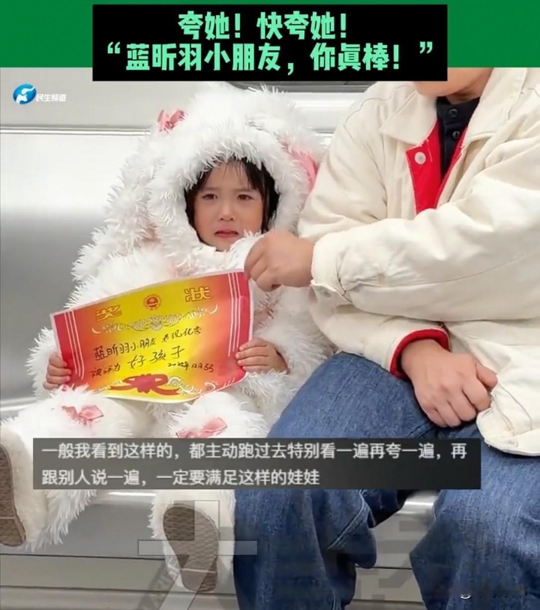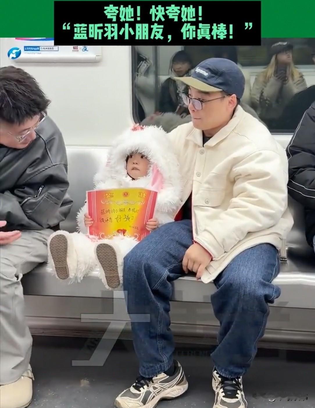广东一地铁里,男子捂鼻转头,满脸尴尬。身旁娃高举奖状,满脸写着:“快来夸我啊!”他伸手去扯,女儿立刻瘪嘴,把奖状往回一拽,满脸不服。 这天下午,男子和往常一样去幼儿园接女儿回家。 刚走到幼儿园门口,就看见一个小小的身影,从里面蹦蹦跳跳地冲了过来。 “爸爸!爸爸!你快看!” 小姑娘跑到男子面前,迫不及待地把奖状展开,高高举到爸爸眼前,声音清脆又响亮,满是抑制不住的骄傲,“老师给我发奖状啦!我是‘好孩子’!” 男子停下脚步,弯腰接过奖状,指尖轻轻拂过上面工整的字迹:“蓝昕羽小朋友表现优秀,被评为‘好孩子’!” 他忍不住嘴角上扬,伸手摸摸女儿柔软的头发,声音温柔又宠溺:“我们昕羽真棒!不愧是爸爸的小骄傲!” 小女孩被夸得眼睛弯成了月牙,把奖状小心翼翼地折好,又攥在手里,一路上都蹦蹦跳跳的,时不时就把奖状拿出来看一眼,仿佛那是全世界最珍贵的宝贝。 很快,父女俩就坐上了回家的地铁。 车厢里不算拥挤,但也坐满了人。 男子把女儿安顿在座位上,刚坐下,转头就看见女儿把奖状重新展开。 她双手高高把奖状举起,身子坐得笔直,小脑袋微微仰着,眼睛亮晶晶地扫视着周围的乘客,脸上明明白白地写着:“快来夸我啊!我得了奖状呢!” 男子瞬间有些尴尬,脸颊微微发烫,连忙凑到女儿耳边,压低声音,语气带着点讨好:“宝宝乖,快把奖状放下好不好?这么多人看着呢,有点不好意思。” 小姑娘用力摇了摇头,小眉头一皱,嘴巴撅了起来,声音却依旧响亮:“不嘛不嘛!我就要举着!这是老师给我的奖状,要让大家都看看!” 男子没办法,只能无奈地叹了口气,抬起手捂住鼻子,猛地转过头去,假装自己没看见。 可没过多久,他就感觉到越来越多的目光落在了他们身上,有好奇的,有善意的,还有人忍不住偷偷笑了起来。 男子的脸更红了,坐立不安,连忙伸手想去扯女儿手里的奖状,想把它收起来:“听话,快放下,咱们回家再举好不好?” 谁知,他的手刚碰到奖状,女儿就立刻瘪起了小嘴,眼眶瞬间红了,小手紧紧攥着奖状往回一拽,像是受了天大的委屈,声音带着点哽咽:“不要!爸爸坏!我就要举着我的奖状!” 爸爸被女儿这副较真的小模样弄得哭笑不得,只好悻悻地收回手,转头对着旁边忍不住笑出声的乘客尴尬地笑了笑,眼里满是无奈,却又藏着藏不住的宠溺。 娃举奖状盼夸奖,爸爸尴尬又无奈,这反差太可爱。孩子的骄傲最真,大人的包容最暖,真是“童心无价,父爱如山”,看着心里都软乎乎的。