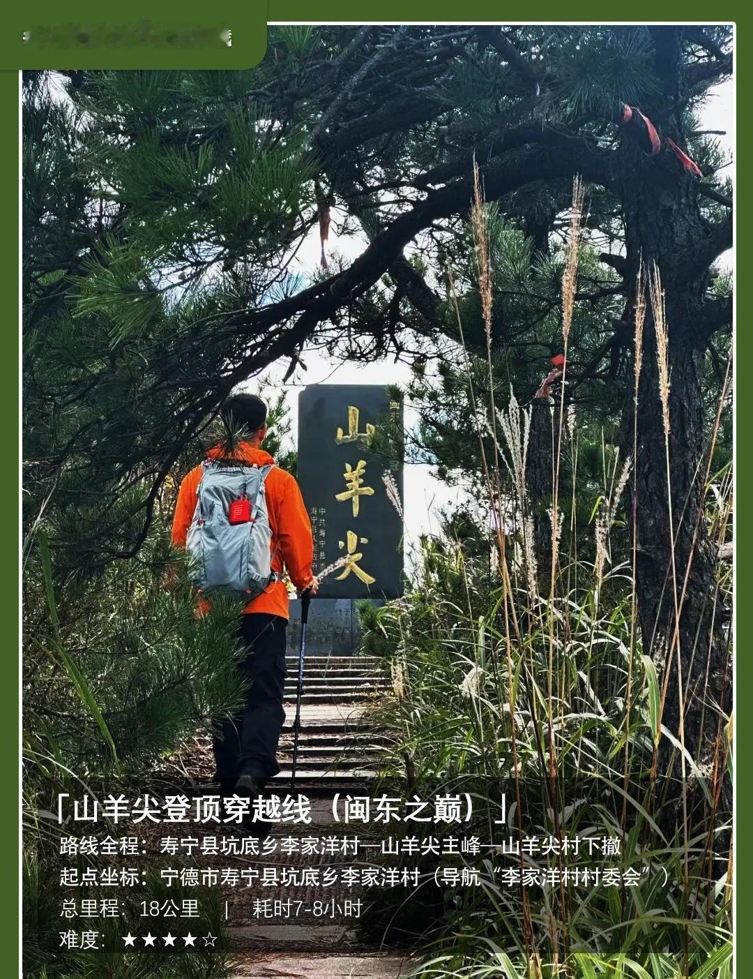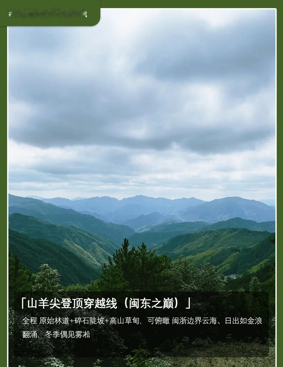 第6️⃣站 宁德|后悔为什么不早来宁德徒步 宁德!宁德! very !古德! 这次我们用双脚丈量「宁德」 🌟 第6️⃣站:宁德 🥾 从海上草原到闽东之巅,从亿年石林到千年古道! 宁德的徒步路线真的是very 古德! ⛰️ 宁德最🔥5条必徒步路线推荐 1️⃣.嵛山岛环岛徒步线 起点:福鼎市嵛山岛码头(乘船抵达后步行至马祖村) 总里程:15 km 耗时:4.5–6 小时 实用贴士: 🚢交通:霞浦三沙/渔井码头乘船上岛(40分钟,往返¥100,旺季需提前3天预约) 🎒装备:防晒衣、遮阳帽、运动鞋(草甸蚊虫多,5–9月带驱蚊液) ⚠️安全:17:00前务必返回码头;雨天草甸湿滑,慎行 2️⃣. 山羊尖登顶穿越线(闽东之巅) 起点:宁德市寿宁县坑底乡李家洋村(导航“李家洋村村委会”) 总里程:18 km 耗时:7–8 小时 实用贴士: 🚌交通:建议包车或自驾出行,无公共交通 💧补给:全程无补给点,需自备3L水+高能食物 ⚠️安全:严禁雨天/大风天攀登!下撤路段陡峭易迷路,建议下载两步路轨迹 3️⃣. 太姥山经典徒步穿越线 起点:福鼎市太姥山镇秦屿游客中心(北门) 总里程:12 km 耗时:5–6 小时 实用贴士: 🚌交通:福鼎动车站打车20分钟直达;景区内有观光车(可节省体力) 💧补给:景区内多处便利店+简餐(推荐太姥山素面) ⚠️安全:雨后岩石极滑!勿单独进入未开发洞穴;夏季注意蛇虫 4️⃣. 闽东大峡谷溯溪穿越线(周宁·九龙漈延伸段) 起点:宁德市周宁县礼门乡陈峭村(导航“陈峭古村停车场”) 总里程:14 km 耗时:6–7 小时 实用贴士: 🚌交通:宁德北站包车至陈峭村(约2.5小时) 💧补给:起点陈峭村有农家乐,峡谷内无补给 ⚠️安全:严禁雷雨天进入!部分深潭暗流强,勿贸然跳水;建议结伴 5️⃣. 飞鸾岭古道穿越线(蕉城—罗源) 起点:宁德市蕉城区飞鸾镇向阳里村(导航“向阳里村口”) 总里程:22 km 耗时:7–8 小时 实用贴士: 🚌交通:宁德市区公交至飞鸾镇,再打车至向阳里村 🎒装备:舒适徒步鞋、遮阳帽、充电宝(部分路段无信号) ⚠️安全:古道部分路段被植被覆盖,建议下载轨迹;夏季注意防蛇 徒步后你最想吃哪一道宁德美食?或者吃过哪道宁德美食让你念念不忘?快来告诉我吧👇 宁德 户外 福建小众旅行 徒步治愈一切 户外穿搭灵感 爆款路线 户外徒步 福建周边游