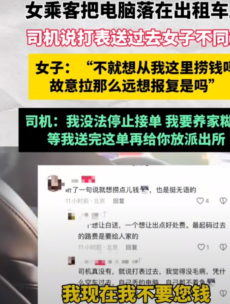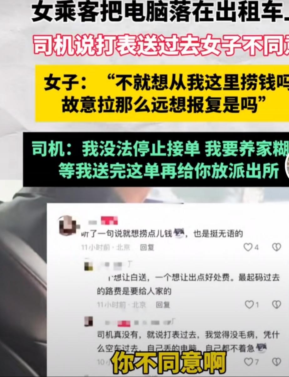 北京女乘客落电脑拒付打表费:别让恶意揣测,凉了善良的心 12月10日,北京这起司乘纠纷在网上引发热议。女乘客不慎将电脑遗落在出租车上,满心期待找回贵重物品,可当司机提议打表送还时,她却瞬间炸毛,直言“不就是想从我这捞钱吗?不同意你就报复我”。司机无奈回应“没法停止接单,等我送完再给你放派出所”,一句话道出了从业者的两难。 谁没丢过东西?那种慌乱无措、生怕重要物品遗失的心情,想必很多人都有过。电脑里可能存着工作文件、私密资料,对失主而言价值千金,可这就能成为质疑他人善意的理由吗?司机跑网约车本就是靠接单赚钱,专程送还失物意味着要暂停接单、额外付出油费和时间成本,打表收费本是合理诉求,却被贴上“捞钱”“报复”的标签,未免太过伤人。 反观现实中,有太多拾金不昧的温暖瞬间。济南环卫工李后方捡到装着电脑、现金的背包,原地等候并主动联系失主,谢绝所有酬金;银川保洁员易薇捡到40克金条,毫不犹豫上交,连失主的感谢费都坚决退回 。这些普通人用行动诠释着诚信,可总有人把别人的善良当理所当然,甚至用最大的恶意揣测他人。 法律早已明确,拾得人有权要求支付保管、送还遗失物的必要费用,打表收费远低于合理范畴,既不是漫天要价,更谈不上“捞钱” 。司机最终选择送完订单再交派出所,已经尽到了法定责任,没有让矛盾升级。 我们总盼着遇事有人伸出援手,可当别人愿意帮忙时,又用猜忌将人推开。一句恶意揣测的话,寒的是一个从业者的心,也可能让更多人在遇到类似情况时选择袖手旁观。试想如果人人都带着防备和敌意,下次丢东西的人,还能顺利找回失物吗? 善良从来都该双向奔赴,尊重他人的劳动付出,才是对善意最好的回应。你觉得司机打表送还是合理诉求吗?如果是你会怎么处理?欢迎在评论区聊聊你的看法。#电脑遗落网约车上#司机打表送还电脑#顺利找回失物