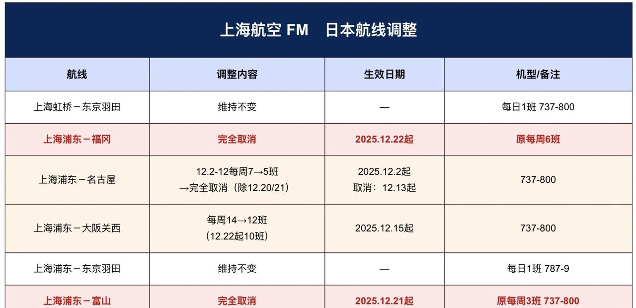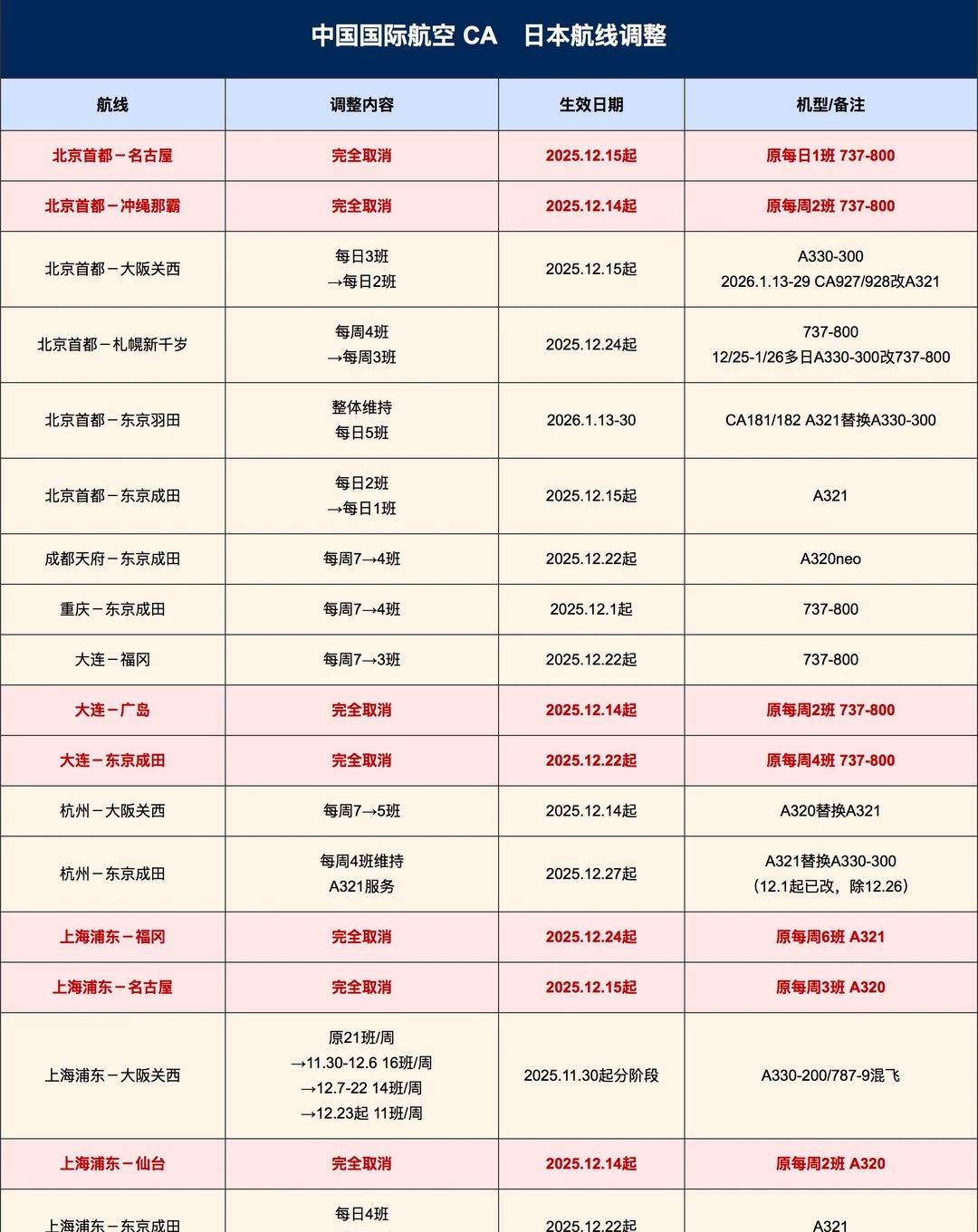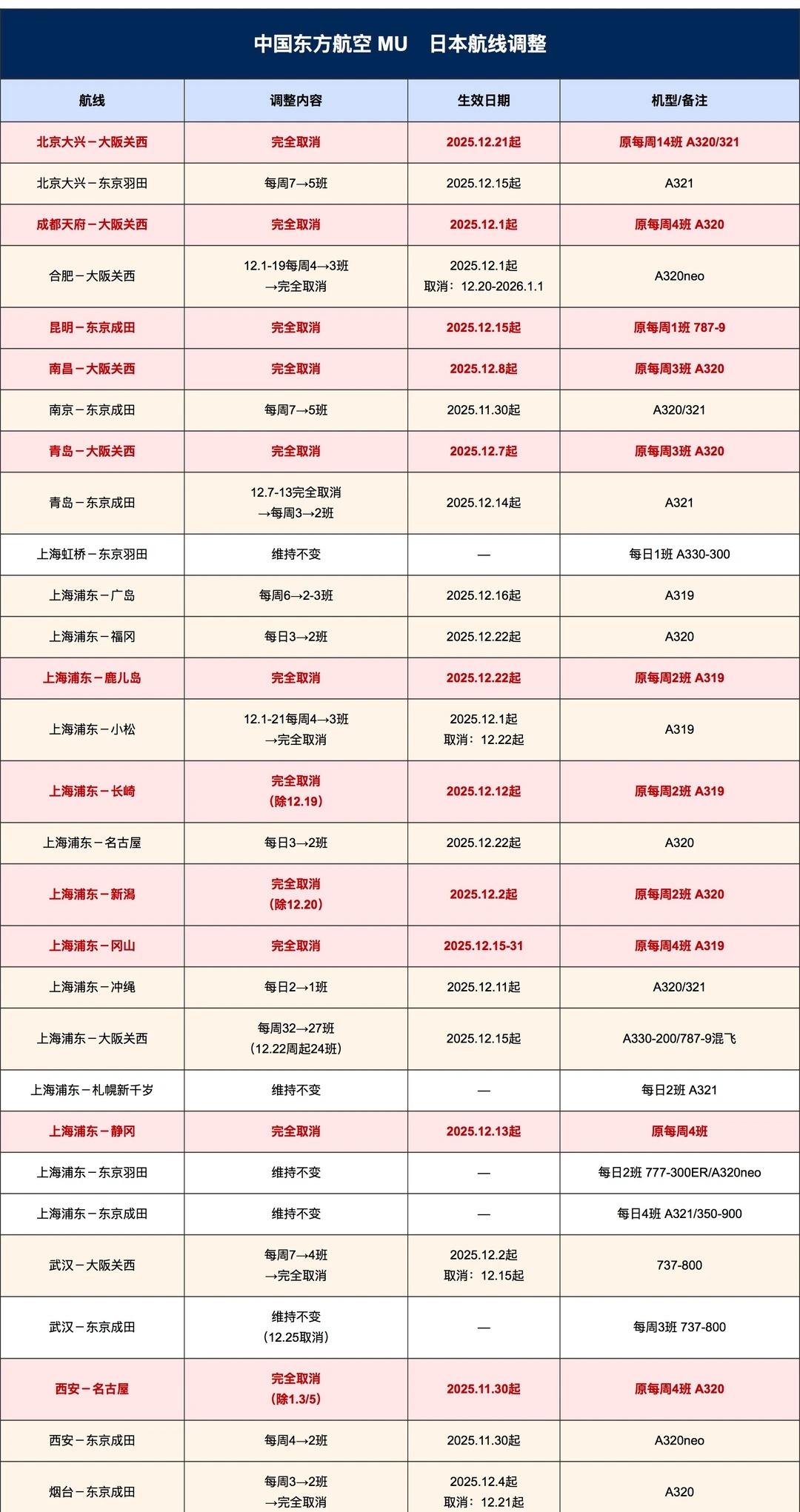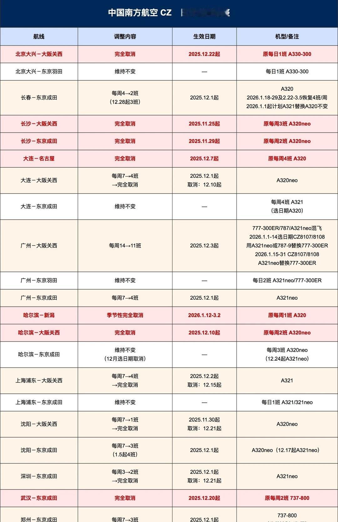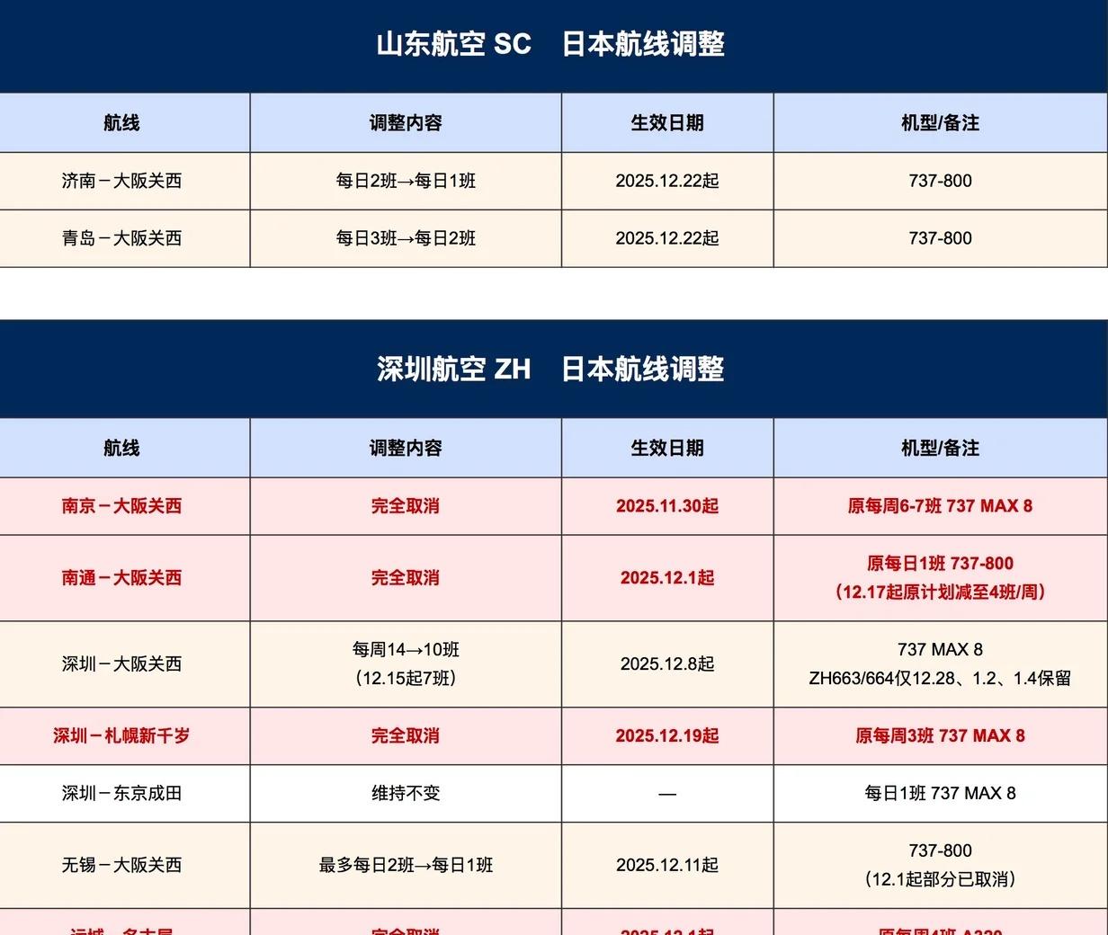 日本航线继续取消!三大航成为重灾区! • 三大航在2025/26冬春季继续大幅取消/减班日本航线,削减幅度约在四到五成之间。整体上,三大航都在压缩日本市场运力,收缩二三线与地方航点,只保中日主干商务与旅游大城。从目前的局势来看,这个减班潮估计会延续到明年年初甚至更久,所以这几个月有去日本玩的朋友们记得多加留意航班信息和航空公司的公布,而且也要注意安全!如果后续再有不同的调整更新,我也会尽快发布! • 国航集团每周航班由184班减至104班,削减约44%!-大量二三線城市的日本航线停飞或重砍班次。-北京首都–东京/大阪、成都/重庆/杭州–东京等主干线保留但降班次,换成A321、B737等窄体机。-上海浦东–福冈、名古屋、仙台等部分航线停飞,东京成田减半。 • 南航每周航班由119班减至61班,航线从21条减到10条,削减近50%!-长沙、大连、沈阳、武汉、深圳等多城飞大阪关西、东京成田的航线集中停飞。-广州、北京大兴至东京/大阪等核心航线大体保留但减班。 • 东航集团(含上航)12月下旬一周内从242班减至约141班,航线从28条减到13条,削减约42%!-大量内地城市–大阪/成田/名古屋支线停飞。-浦东–广岛、鹿儿岛、小松、新潟、冈山、静冈、富山等“卫星航点”集中撤出!-浦东/虹桥–东京和浦东–札幌等高需求主干线基本维持。 P2 中国国际航空P3 山东、深圳航空P4 中国东方航空P5 上海航空P6 中国南方航空 航班 航空 中日关系 中日航班 中日航班取消