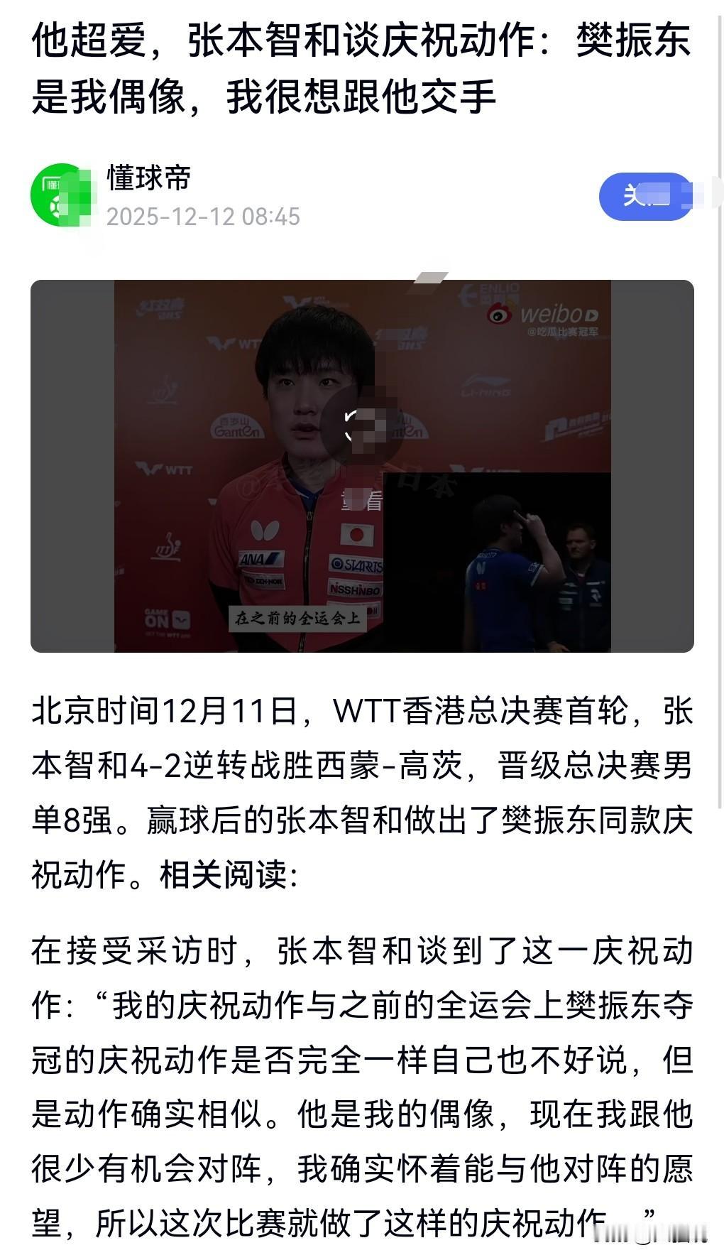 哈哈哈…… 张本智和这人有时候还挺逗的,他在赛场上做出了樊振东同款的庆祝动作。 他接受采访时称,樊振东是他偶像,他希望和樊振东交手,但现在很少有机会。 他说樊振东是他的偶像,这倒是让我挺意外的。 看来樊振东真的是很多人的目标和对手。 不愧是站在世界之巅的乒乓球运动员。