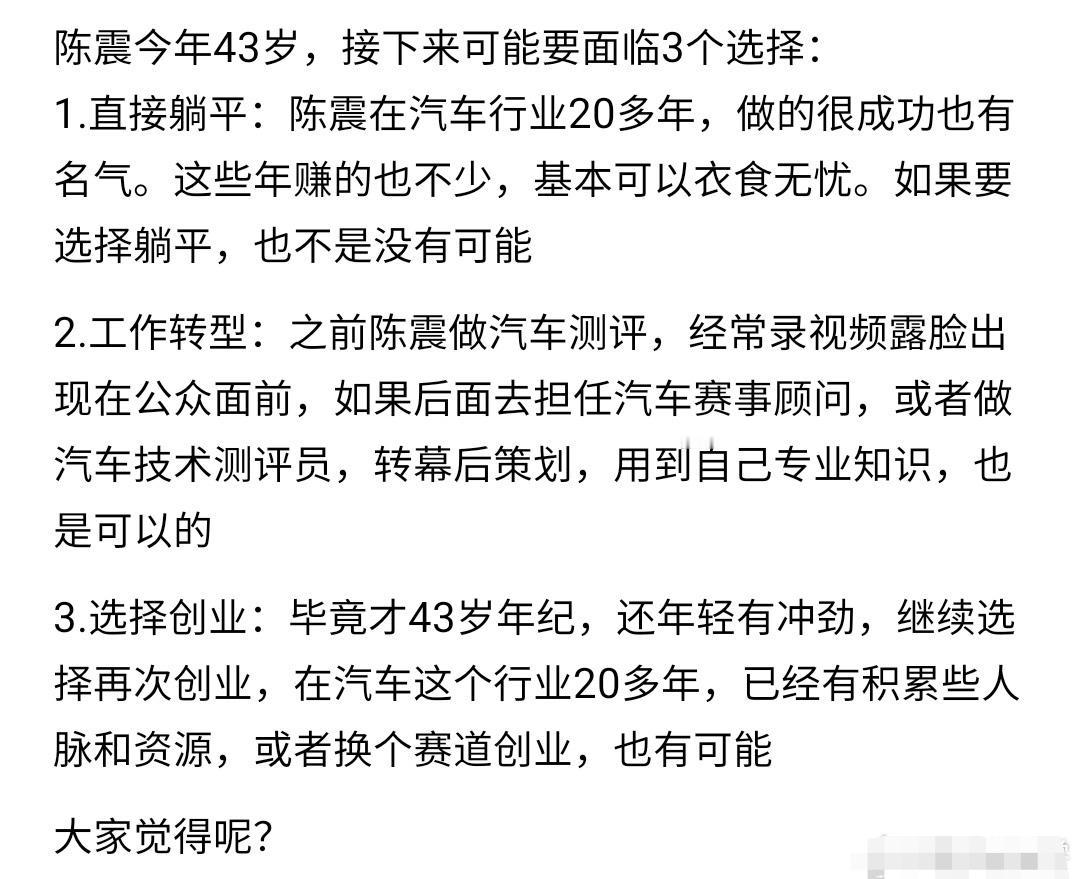 网友猜测的陈震接下来的三个选择。 我觉得转幕后最有可能,你们觉得呢?