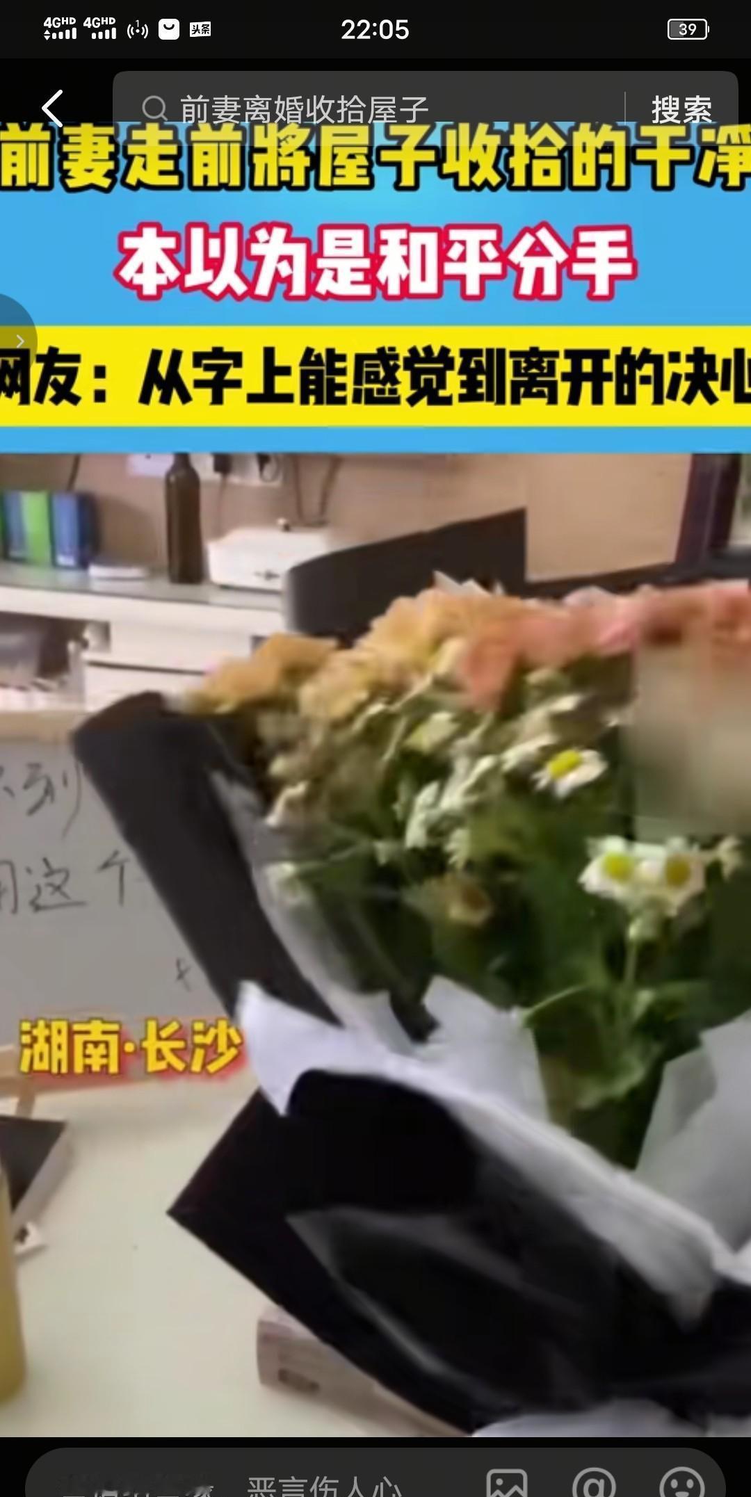 湖南长沙, 一名男子跟妻子离婚回到家中发现妻子离开前将屋子收拾的干干净净, 忍不住哭了 ! 展报上的字迹清秀却带着一丝颤抖——“买不到白色的,用这个代,再见”,他盯着茶几上那束淡黄色的菊花,花瓣边缘还沾着未干的水渍。 他伸手碰了碰花瓣,指尖冰凉,这才后知后觉地打量起这个刚“解脱”的家。 沙发套边角拉得笔直,他常堆在上面的外套不见踪影;茶几上的玻璃杯杯口朝上,杯壁没有一丝指纹;连阳台那盆他养死过三次的绿萝,都换了新的营养土,叶片擦得发亮。 “她什么时候做的?”他蹲下身,看到电视柜抽屉里的电线——以前总缠成一团,现在用扎带捆得整整齐齐,标签上写着“路由器线”“电视线”,字迹是她惯常的小楷。 记忆突然翻涌。她总在他熬夜加班后,轻手轻脚地收拾他散落的文件;他醉酒吐脏的床单,第二天醒来永远带着阳光晒过的味道;甚至他随口抱怨“厨房油烟重”,隔周就多了个壁挂式抽油烟机。 离婚那天,他说“这样大家都轻松”,她低着头没说话,只在签字时笔尖顿了一下。他以为她早盼着离开,毕竟他总说“你管得太多”“家里乱点才像家”。 那束菊花,他想起去年她生日,他随手买了束黄菊,她笑着捶他:“这是长寿菊,要一起活到九十九才准送”,如今却成了她留给这个家的最后一件“礼物”。 他走到灶台前,瓷砖擦得能映出他的影子,旁边放着她常用的钢丝球,刷毛已经磨平了大半。 “以后……真的没人管我了。”他靠在厨房门框上,喉咙突然发紧,眼泪毫无预兆地砸在地板上,溅开一小朵湿痕。 她把家收拾成了他最“想要”的样子——没有争吵,没有唠叨,连空气都变得“清爽”,可每个角落都刻着她的名字。 她走了,带着他所有的不耐烦和她最后的温柔,留下一个干净到陌生的家,和一个终于明白却追不回的遗憾。