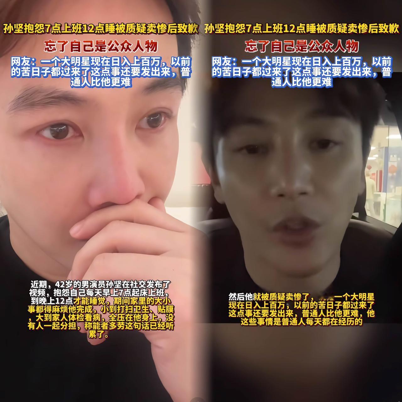 明星赚钱有多容易? 看看孙坚这波操作就懂了! 孙坚,一个四五线演员,居然觉得每天睡7个小时就是很累了,说自己12点睡7点起,仿佛遭受了天大的委屈。结果网友不买账,纷纷吐槽他这是在“卖惨”。 其实,明星有压力、会累很正常,但抱怨也得看对象啊!孙坚一天赚的钱,普通人可能得辛苦一年才能挣到。 他在普通人面前诉苦,就像“何不食肉糜”的现代版,谁能共情?更何况,7点起12点睡,对普通人来说不过是日常,他这偶尔的“辛苦”,在普通人眼里根本不算啥。 所以说,明星们还是多体谅下普通人的不易吧,别轻易在大众面前“喊累”。 你觉得孙坚这波操作是真心抱怨,还是故意卖惨呢?快来评论区聊聊你的看法!