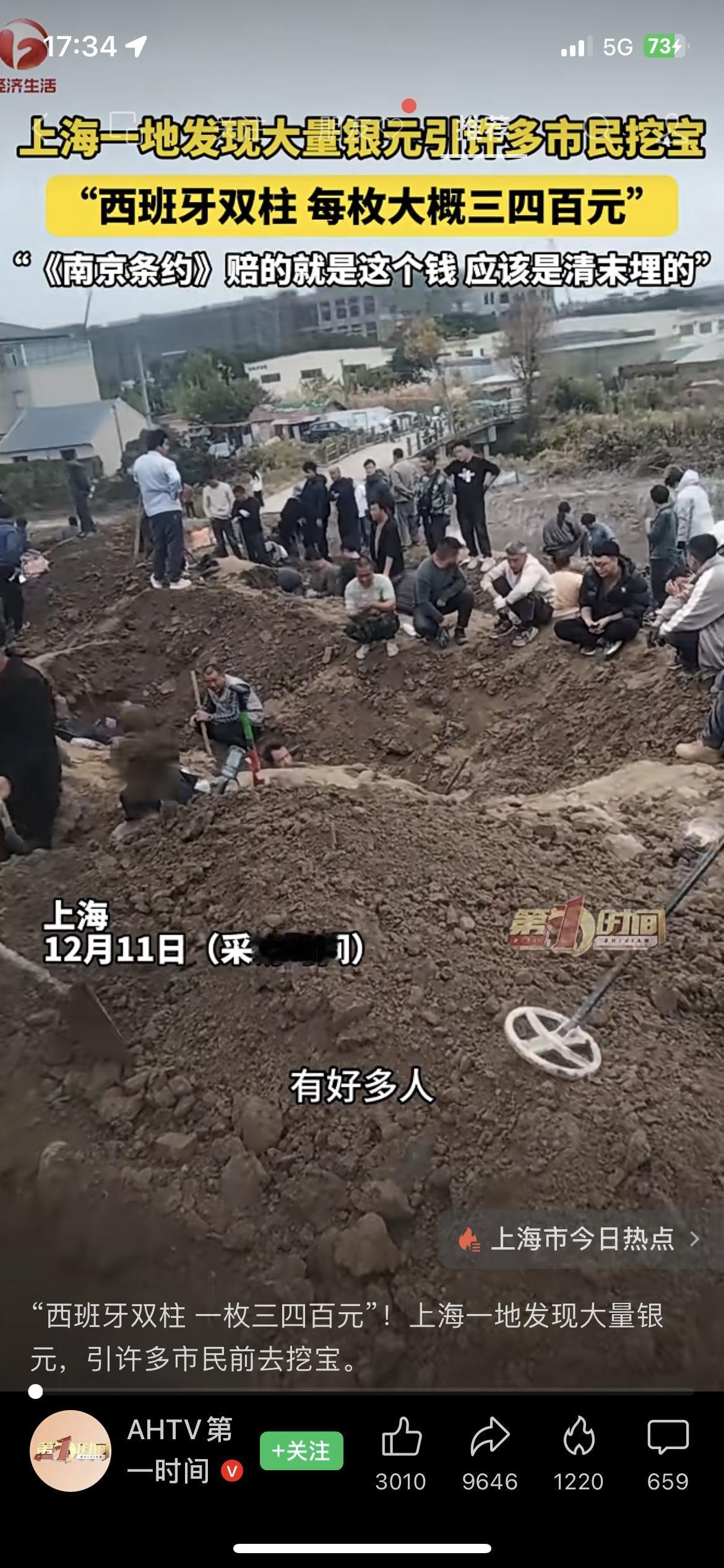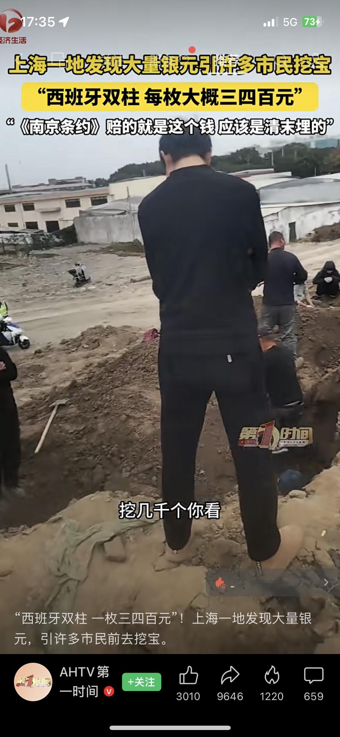 上海现挖宝潮!银元一枚值几百,别乱挖银元 上海一地挖出大量西班牙双柱银元,一枚能卖三四百,市民全跑去挖了,有人说这是清末埋的,还和《南京条约》赔款有关。 但咱普通人别跟风:① 地下文物归国家,私自挖掘涉嫌违法;② 工地挖宝有坍塌风险,安全第一。 真捡到银元,赶紧上交当地文物部门,别自己留着。 你见过这种老银元吗?评论区晒见识~