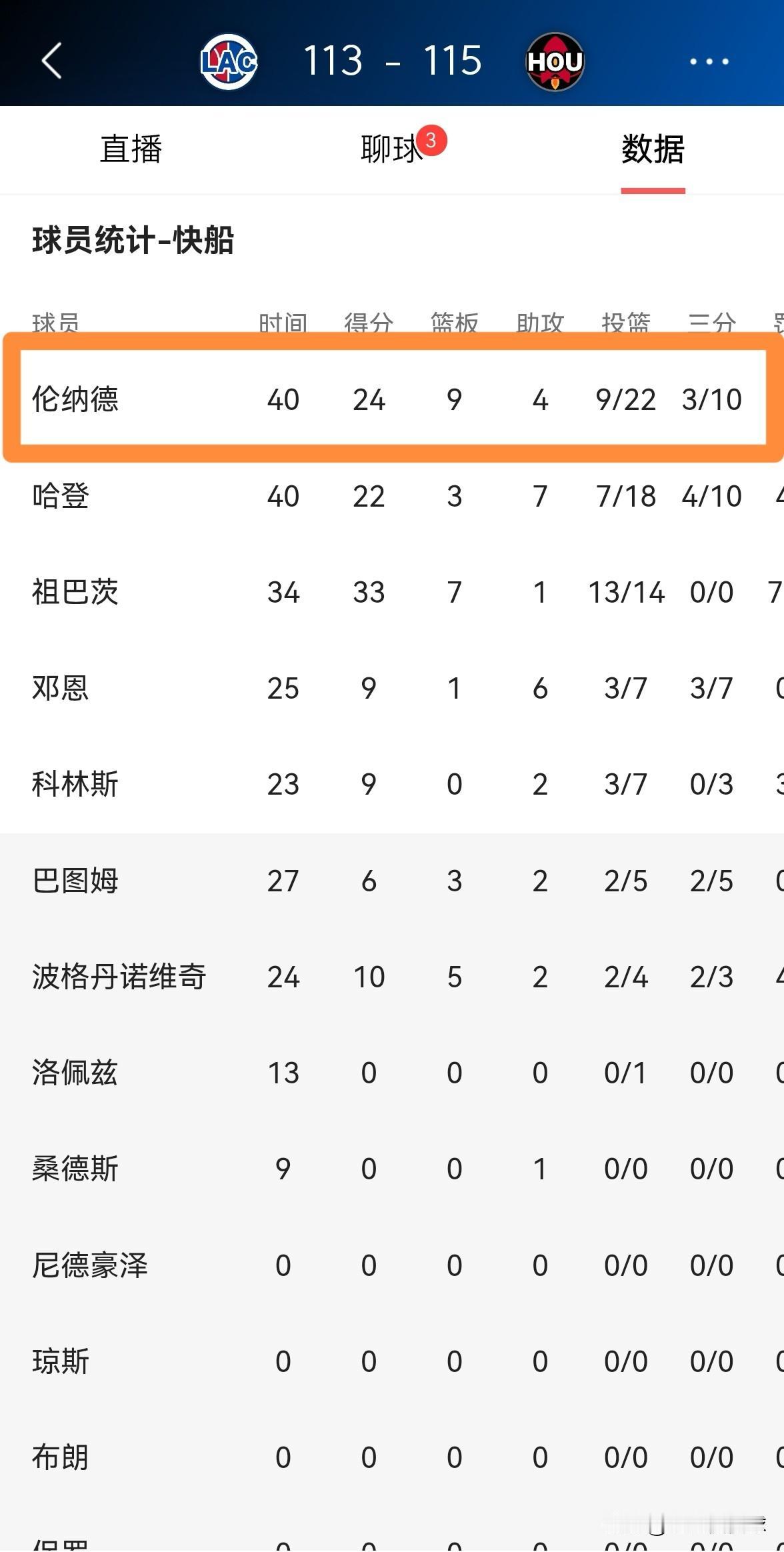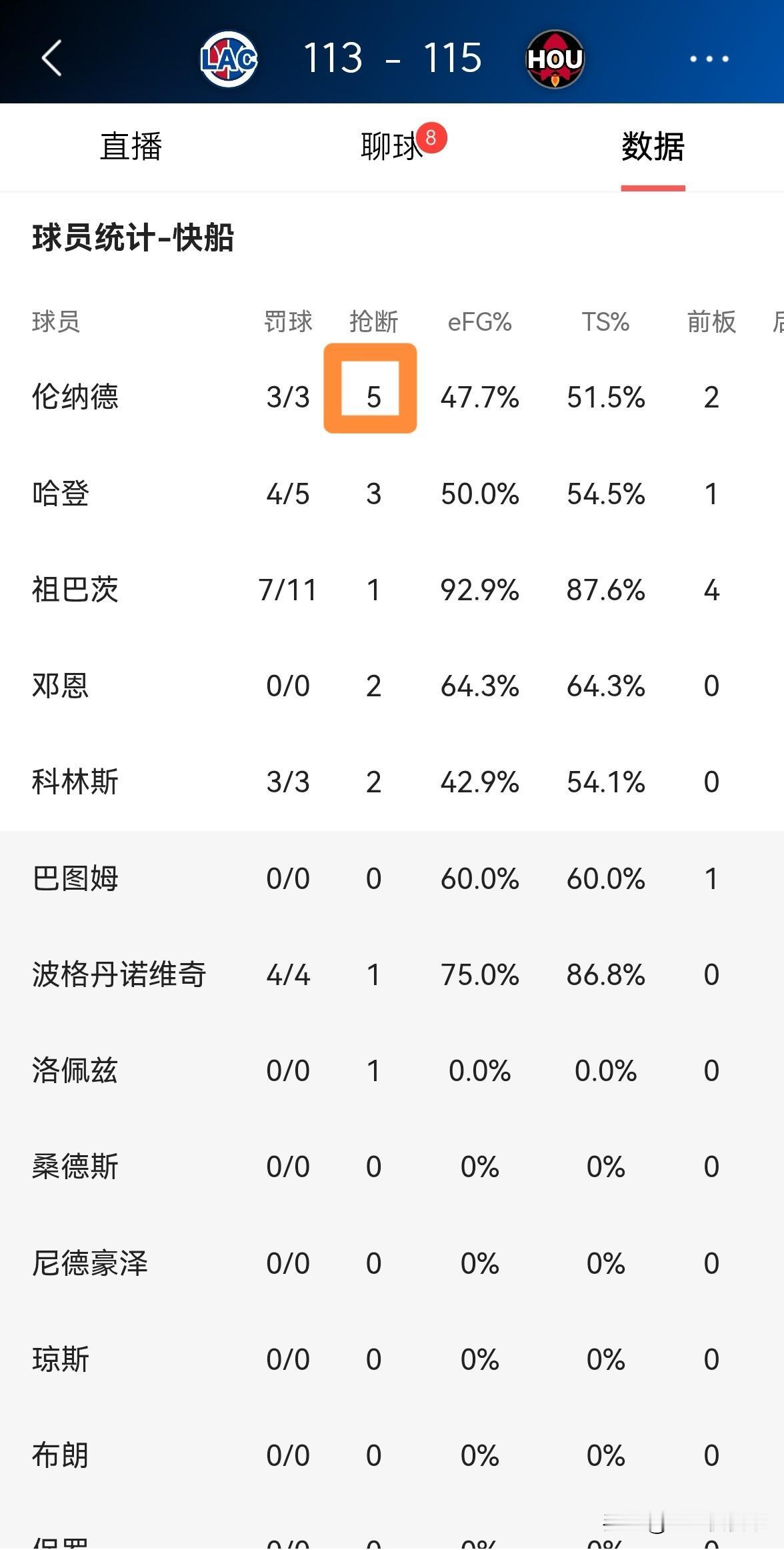 快船超级球星伦纳德的抢断能力真是太强了!在今天快船客场以113:115输给火箭的比赛中,虽然伦纳德的进攻效率不高,但是他却送出了不可思议的5次抢断,展现了自己超强的防守能力。 全场比赛下来,伦纳德首发出战40分钟,投篮22中9,其中三分球10中3、罚球3中3得到24分,不过有5次抢断。