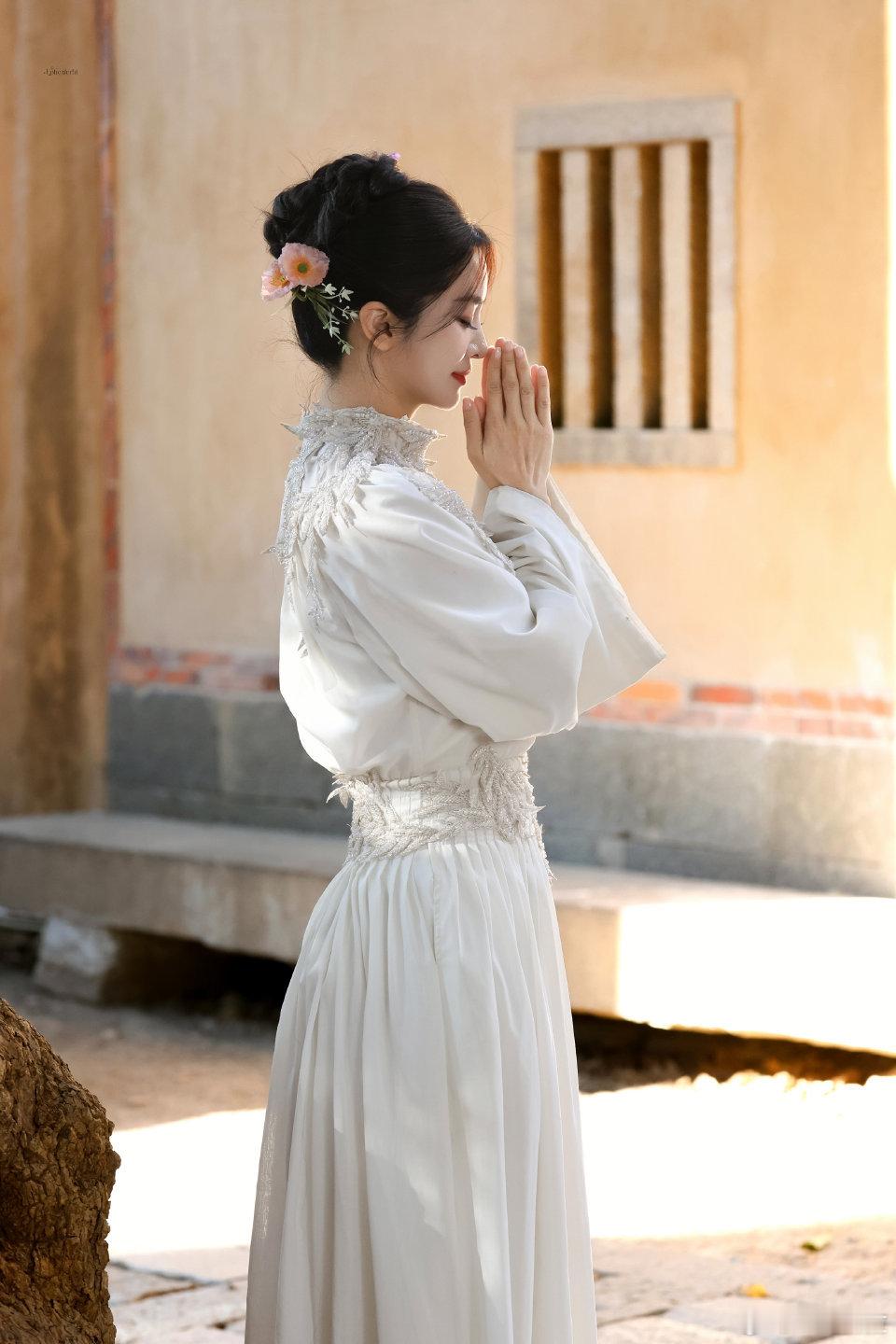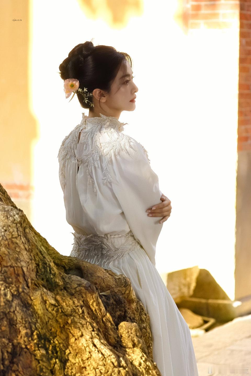 刘亦菲这一身衣服太丑了,用花挡住了才觉得好一点,全靠脸撑着