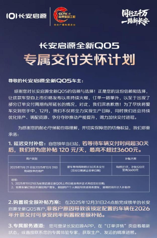 车若初见 3万+订单工厂满载,长安启源新车等的确实有点长了,现在推出延迟交付补偿的等车礼:锁单超过30天还未提车,提供120元/天的补贴,累计最高不超过3600元,全新Q05激光版也将在20号开始陆续交付,后续启源会抓生产,搞交付,着急提车的小伙伴可以宽宽心了。