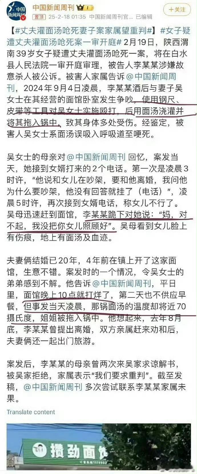 【灌面汤杀妻案李某春死缓】吴某莉因吸入面汤窒息死亡 我是没看明白。三天前媒体报道该案的时候还是话题灌面汤杀妻案女方家属称绝不谅解,受害女子吴某莉的弟弟吴先生强调,他和家人的态度依然很明确,绝不签谅解书,希望法院依法重判李某春,“判处李某春死刑。”今天的判决书中却写道“且李某春取得了被害人亲属谅解,故对其从轻处罚”。希望吴先生就此做一个说明。全网热点共创计划