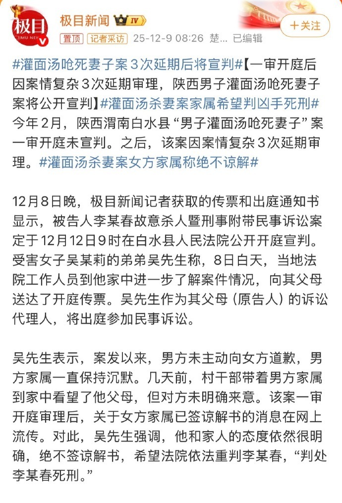 灌面汤案丈夫取得被害人亲属谅解【灌面汤杀妻案李某春死缓】互联网是有记忆的。三天前《极目新闻》灌面汤杀妻案女方家属称绝不谅解,称受害女子吴某莉的弟弟吴先生强调,他和家人的态度依然很明确,绝不签谅解书,希望法院依法重判李某春,“判处李某春死刑。”该案此前已开庭,今天仅仅是宣判,这两三天时间吴先生一家会作出这样的改变?即使吴先生一家作出这样的改变,法院转变也这么快吗?请吴先生解释一下。