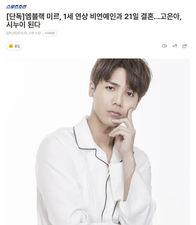 MBLAQ成员MIR结婚MBLAQ成员MIR官宣结婚MBLAQ MIR将于21日结婚 12日据独家报道,MBLAQ成员MIR将于21日在京畿城南某地举行婚礼。准新娘是比MIR大一岁的素人女性,两人以长期交往所积累的信任和信赖为基础,结下了夫妻之缘。