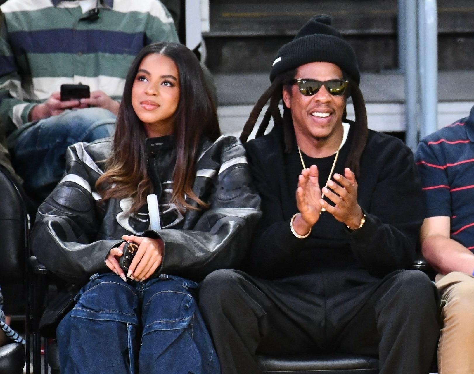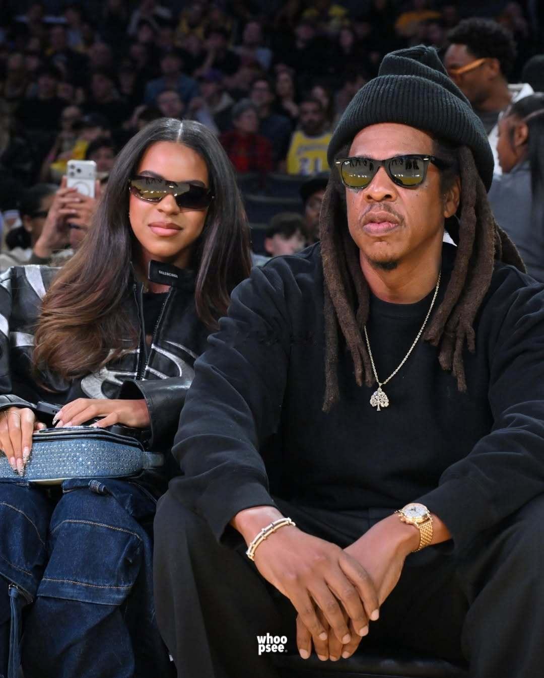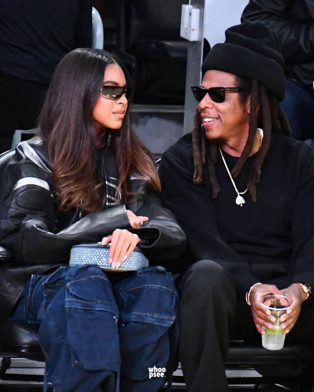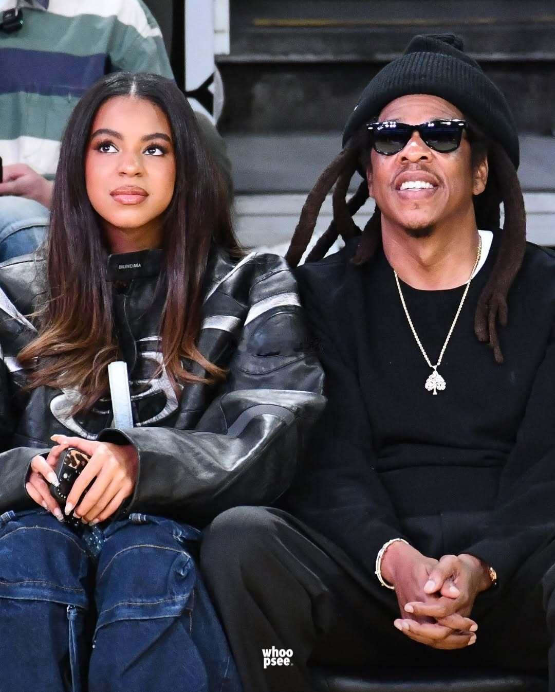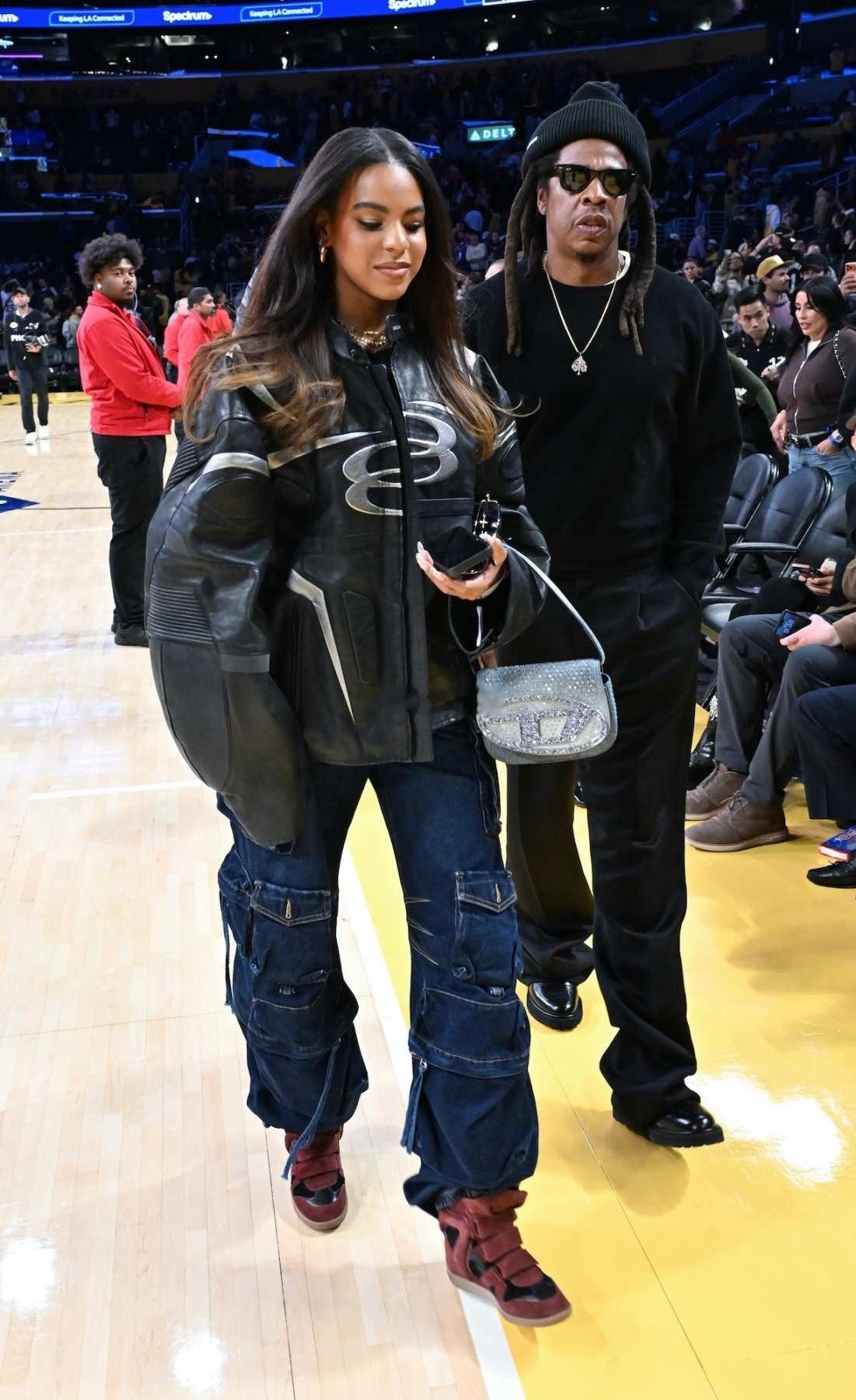巨星之女‼️碧昂丝13岁的女儿Blue Ivy跟老爸Jay-Z一起现身湖人队对阵马刺队的比赛前排👇(巴黎世家超大号皮夹克➕The Attico的牛仔工装裤➕Isabel Marant的鞋➕Diesel镶钻水洗牛仔包)
