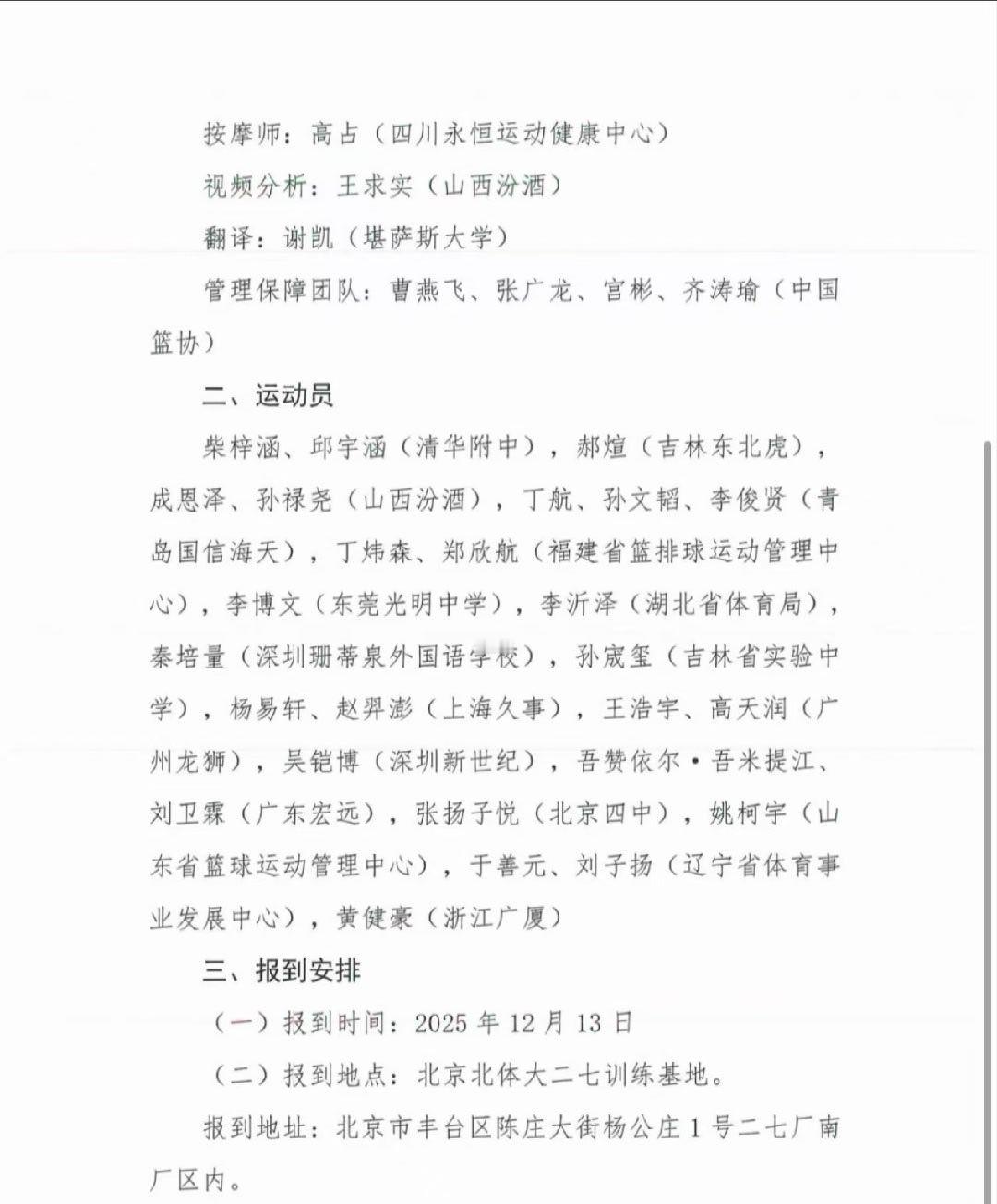明年U18国青第一次集训来了,王建军任主教练,王锡东执行教练cba 运动员名单:柴梓涵、邱宇涵(清华附中),郝煊(吉林东北虎),成恩泽、孙禄尧(山西汾酒),丁航、孙文韬、李俊贤(青岛国信海天),丁炜森、郑欣航(福建省篮排球运动管理中心),李博文(东莞光明中学),李沂泽(湖北省体育局),秦培量(深圳珊蒂泉外国语学校),孙玺(吉林省实验中学),杨易轩、赵羿澎(上海久事),王浩宇、高天润(广州龙狮),吴铠博(深圳新世纪),吾赞依尔·吾米提江、刘卫霖(广东宏远),张扬子悦(北京四中),姚柯宇(山东省篮球运动管理中心),于善元、刘子扬(辽宁省体育事业发展中心),黄健豪(浙江广厦)