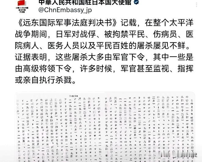 终于到这个环节了!12月11日,中国驻日本大使馆发文表示,《远东国际军事法庭判决书》记载,在整个太平洋战争期间,日军对战俘、被拘禁平民、伤病员、医院病人、医务人员以及平民百姓的屠杀屡见不鲜。 1946年5月3日远东国际军事法庭在东京正式开庭,这场审判持续两年多,最终在1948年11月4日宣读了长达1213页的判决书,这是人类历史上规模最大的国际审判之一。 这份判决书可不是普通文件,它是由中苏美英等11国法官共同裁定,是二战后国际社会对日本军国主义罪行的权威定性,具有不容置疑的国际法效力。 使馆文中提到的日军针对战俘和平民的屠杀,在判决书中有大量详实记录,每一条都对应着具体的惨案和受害者群体,不是空泛的指责。 1945年发生的马尼拉惨案是太平洋战争中典型暴行,日军在撤退前对当地平民展开疯狂屠杀,短短一个月内就有近十万无辜百姓丧命,判决书对此有明确记载。 1942年开始修建的泰缅铁路,被称为“死亡铁路”,数万盟军战俘和东南亚劳工在日军的残酷奴役下丧生,每一根枕木下都可能埋着亡魂,判决书也收录了相关罪行。 除了屠杀,判决书还记录了日军强征超过四百万中国劳工的事实,这些劳工在非人的条件下被迫劳动,最终大量因虐待和过劳死亡,他们的苦难被清晰留存。 更让人愤慨的是日军的“慰安妇”制度,来自中国、朝鲜半岛和东南亚的数万女性被强征,遭受惨无人道的性奴役,这一罪行也被远东法庭牢牢钉在耻辱柱上。 大伙可以扪心自问,这些白纸黑字的判决记录,是多国法官共同认定的铁证,日本某些势力却总想淡化甚至否认,这显然是对历史和受害者的双重背叛。 2025年12月11日当天,外交部发言人郭嘉昆在例行记者会上,也结合这份判决书痛批日本右翼美化侵略的错误言行,和使馆发文形成了呼应。 近期日本政客高市早苗还抛出涉台错误言论,同时试图推动突破和平宪法搞“再军事化”,这种举动和其拒不反思战争罪行的态度是一脉相承的。 俄罗斯、巴基斯坦等多个周边国家在2025年12月上旬纷纷发声,反对日本的错误言行,支持二战后形成的国际秩序,这也体现了国际社会的共同立场。 有个挺讽刺的现象,日本国内有些教科书还在刻意删减战争暴行内容,甚至把侵略说成“解放”,这种自欺欺人的操作,连本国不少有良知的学者都看不下去。 琉球地区在2025年11月向联合国提交的控诉书中,也提到了二战时期日军在当地的屠杀和强征行为,这和远东法庭判决的内容形成了相互印证。 使馆这次发文,不只是简单重提历史,更是用权威法律文书提醒国际社会,要警惕日本军国主义的复苏苗头,守住二战后的和平底线。 咱普通老百姓都明白,忘记历史就等于背叛,何况是这种用无数生命换来的惨痛教训,日本方面要是连这点都拎不清,迟早会被国际社会孤立。 日本国内其实也有不少和平人士,他们常年奔走呼吁正视历史,和右翼势力的歪理邪说对抗,这些人的努力值得尊重,也说明公道自在人心。 那些试图为侵略历史翻案的人,就像想把泼出去的水收回来一样不切实际,历史的印记早就刻在国际法和各国人民的记忆里,根本抹不掉。 尊重历史不是要揪住过去不放,而是为了不让悲剧重演,日本只有彻底反思罪行,才能真正和亚洲邻国建立互信,这是再简单不过的道理。 铭记远东国际军事法庭的判决,不只是对受害者的告慰,更是为了守护当下和未来的和平,这是每个热爱和平的国家和民众都该有的共识。 信息来源:中国驻日本大使馆 X 平台.2025-12-11