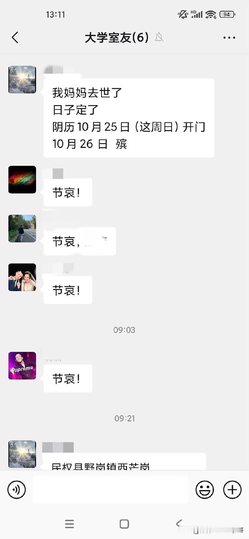 一大早大学同学给我发了一个信息,他也没有逐个通知,他是在我们大学室友群里说的,他老母亲于近日去世了,内心非常的悲伤,这个周六可能就要吊唁和殡葬,我们当时都很震惊,当时我其他同学给我发消息,我还不知道怎么回事儿,然后的话他这样一讲我才知道肯定是家里出事儿了。我在一看群的信息才知道是怎么回事,当时心里也是五味杂陈吧,我同学都群里说兄弟啊,注意节哀!我们才知道发生了这样的事情,内心也是感叹这个岁月无情,从12年本科毕业,到现在差不多有十四五年了,同学当中经历大起大落的人大有人在,这社会上的坑还有陷阱多的数不胜数,岁月很无情,我这个朋友呢,他的年龄啊就比我们稍微大一点,然后他的母亲,父亲可能都70多岁了,所以他也是没有办法,这是天命之所属,他也无可奈何,只能是劝他节哀吧!