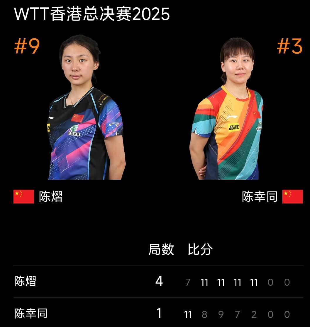 陈熠4-1战胜陈幸同晋级四强! WTT香港总决赛2025 女单四分之一决赛,国乒一场比赛内部战中,小将陈熠以大比分4比1战胜队友陈幸同晋级四强,陈熠今天很好的保护了自己的发球局,在先失一局后,积极调整战术连胜四局逆转胜出,表现相当不错! 恭喜陈熠晋级!半决赛陈熠对阵王曼昱与朱芊曦之间的胜者!
