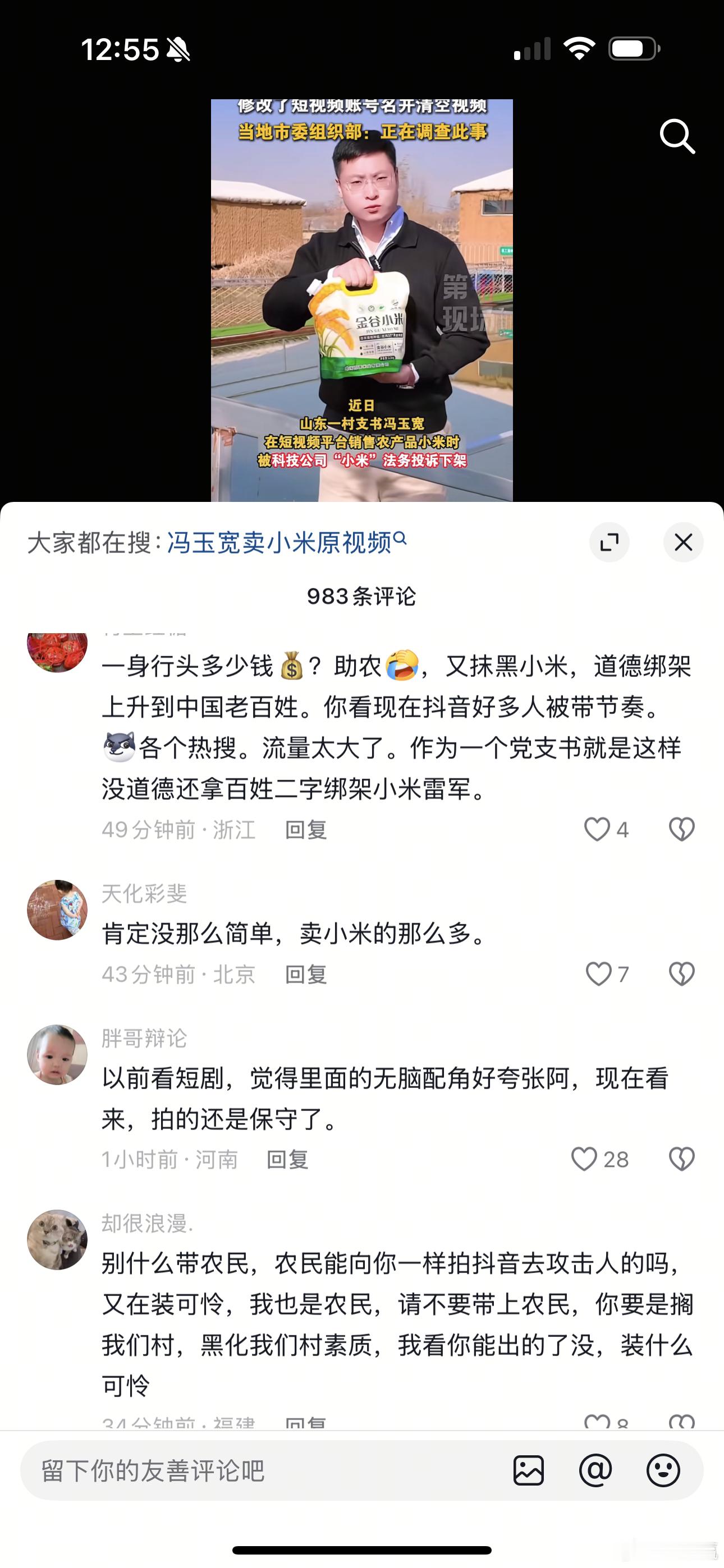 村支书卖小米被投诉看了一下原视频,这个所谓的村支书一点不冤。各种阴阳怪气擦边映射,视频都带着雷军的标签。你阴阳怪气抹黑诋毁别人,别人拿出规则捍卫自己利益,这没什么问题啊。不能只允许你过嘴瘾得便宜,不让别人维护自身权益吧,一出事就哭着说自己弱势群体,太无赖了。