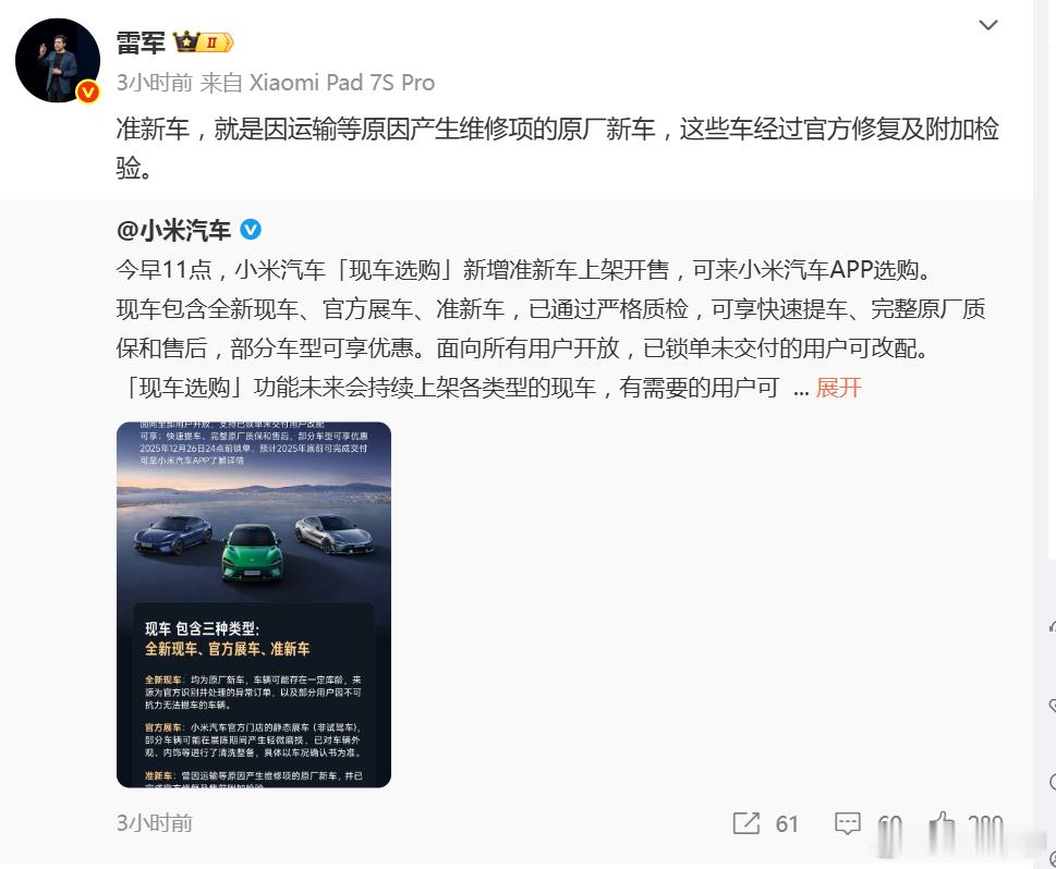 雷军回应小米上架准新车 小米汽车「现车选购」新增准新车上架开售。一般来说,这种准新车(展车/小瑕疵返厂/运输受损返厂)都是内部员工折价购买了,为啥会单独弄一批准新车呢?其他品牌的这类准新车一般都是内部消化掉了,员工也能得优惠,品牌也不用囤货,真是不太懂小米的玩法了。雷军