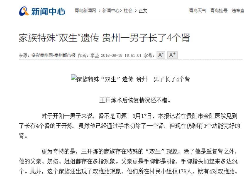 力气特别大,身体相当好。 2016年5月,贵州开阳县的王开炼疼得站不起来。 这个15岁就能单手拎起200斤摩托车的壮汉,怎么也想不到,让他直不起腰的不是劳累,而是肚子里多出来的两个“腰子”。 一开始他以为是干活累着了,硬扛了两天,疼得下不了床才去医院。 CT片子一出来,医生拿着片子来回瞅:“左边俩肾,右边俩?你这是揣了副麻将啊?”后来才知道,这叫重复肾,就是肾在娘胎里长“分身”了。 正常人俩肾,他左右各俩,加起来四个。 医生说这概率比中彩票还低,全国近十年报道还不到30例。 胚胎发育时输尿管芽没长好,就像折纸多折了一道,硬生生折出俩肾盂俩输尿管。 王开炼的片子上,左右肾都能看到没长拢的“双肾盂”,活脱脱胚胎期留的“作业错题”。 更有意思的是他家的“特殊基因”。 王开炼自己有六指,外公也是六指,姨妈还生过双胞胎。 医生猜,他娘当年可能怀的是双胞胎,其中一个没长起来,基因却留给他了,才闹出这“四肾六指”的稀罕事。 我觉得这也难怪,毕竟这些特征在他们家就没断过根。 手术切了个积水严重的肾,现在还剩仨。 医生说人一个肾就够用,仨肾理论上更“抗造”。 但王开炼总觉得不对劲:“以前白酒当水喝,现在半瓶就晕;冬天单衣过冬,现在得穿毛衣。” 一年后复查,他又能扛起摩托车了,医生说这才是仨肾该有的样子。 这事儿还没完,他们村更邪乎。 翁昭村老板凳组48户人家,居然有4对双胞胎,出生率是全国平均的4倍。 有人说跟村里的水有关,含钙镁高;也有人说就是老王家那基因在“发力”。 如今王开炼的三肾运转正常,翁昭村的双胞胎们也慢慢长大。 这个藏在喀斯特山里的小村庄,因为一个“四肾人”,让医生们盯上了那些藏在基因里的秘密。 或许哪天,这些“不一样”的身体,能帮我们解开更多生命的密码。