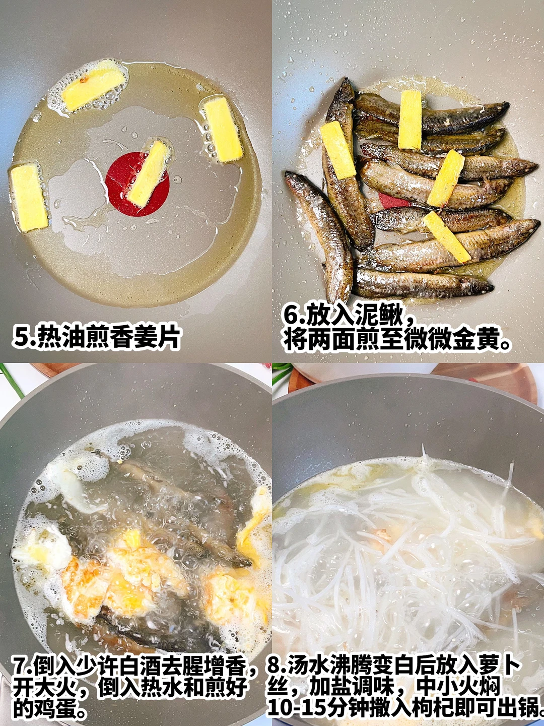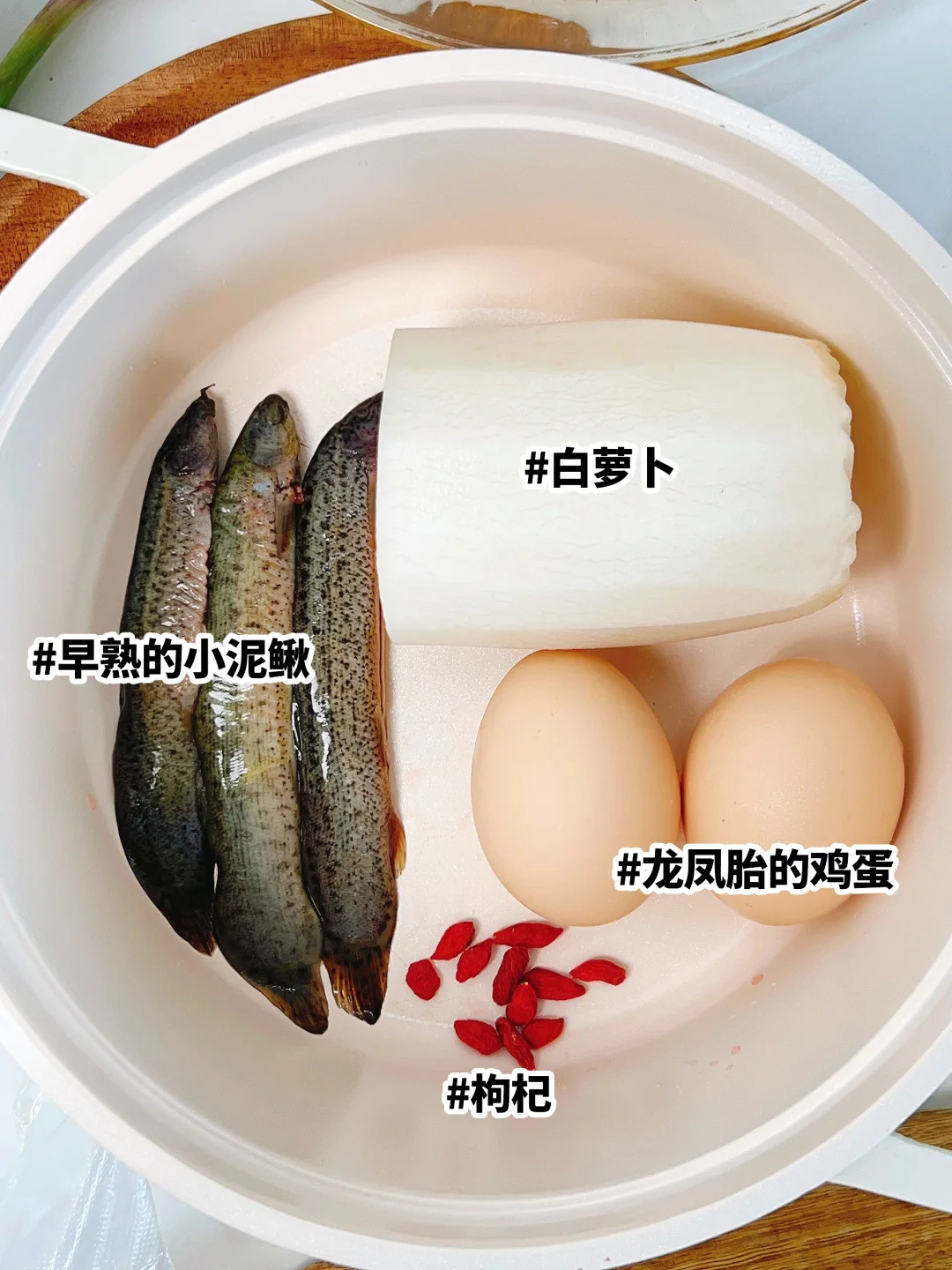 备孕路上,双方提升体内两种“小家伙们”的生产数量与质量至关重要。 今天给正计划生娃的准爸准妈们分享一道非常不错的 备孕辅助汤膳【泥鳅萝卜汤】 泥鳅,“水中人参”之美誉,除了富含优质蛋白和矿物质,还是男女益肾固精、益脾补🩸的滋补好物。 这道汤鲜美又不腻,营养丰富,既能作为备孕夫妻辅食调养,又能满足味蕾😋。 ——▪️食材 ▫️小泥鳅250g ▫️白萝卜适量 ▫️鸡蛋1-2个 ▫️枸杞▫️姜2片▫️葱花 ⭕️提示: 如果平时小蝌质量欠优可以加5-10g菟丝子 ——▪️做法(图4) [一R]泥鳅的处理 活泥鳅放置容器里,撒入适量食盐,待泥鳅嘎后,倒入适量生粉搅浑揉搓,用清水冲洗掉泥鳅表面粘液。 用剪刀从颈部顺着屁屁处剪开,取出内脏,清洗内部。 [二R] 先把鸡蛋煎好取出备用。 [三R] 重新热锅下油,先放姜片煎至香气释放,接着加入泥鳅,中小火煎至两面呈现金黄色(注意火候,避免煎煮过度导致肉质变干)。 [四R] 转为大火,将煎蛋回锅,倒入热水,倒入一并盖的白酒(提鲜去腥)待汤品沸腾后。萝卜切丝加入汤中,下盐调味,中小火继续焖炖10-15分钟。 [五R]最后撒入枸杞,汤味又鲜又浓,巨好喝。😋