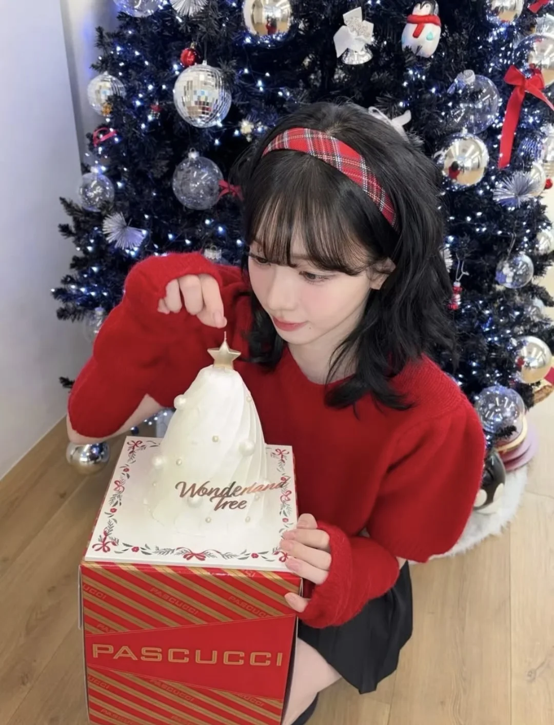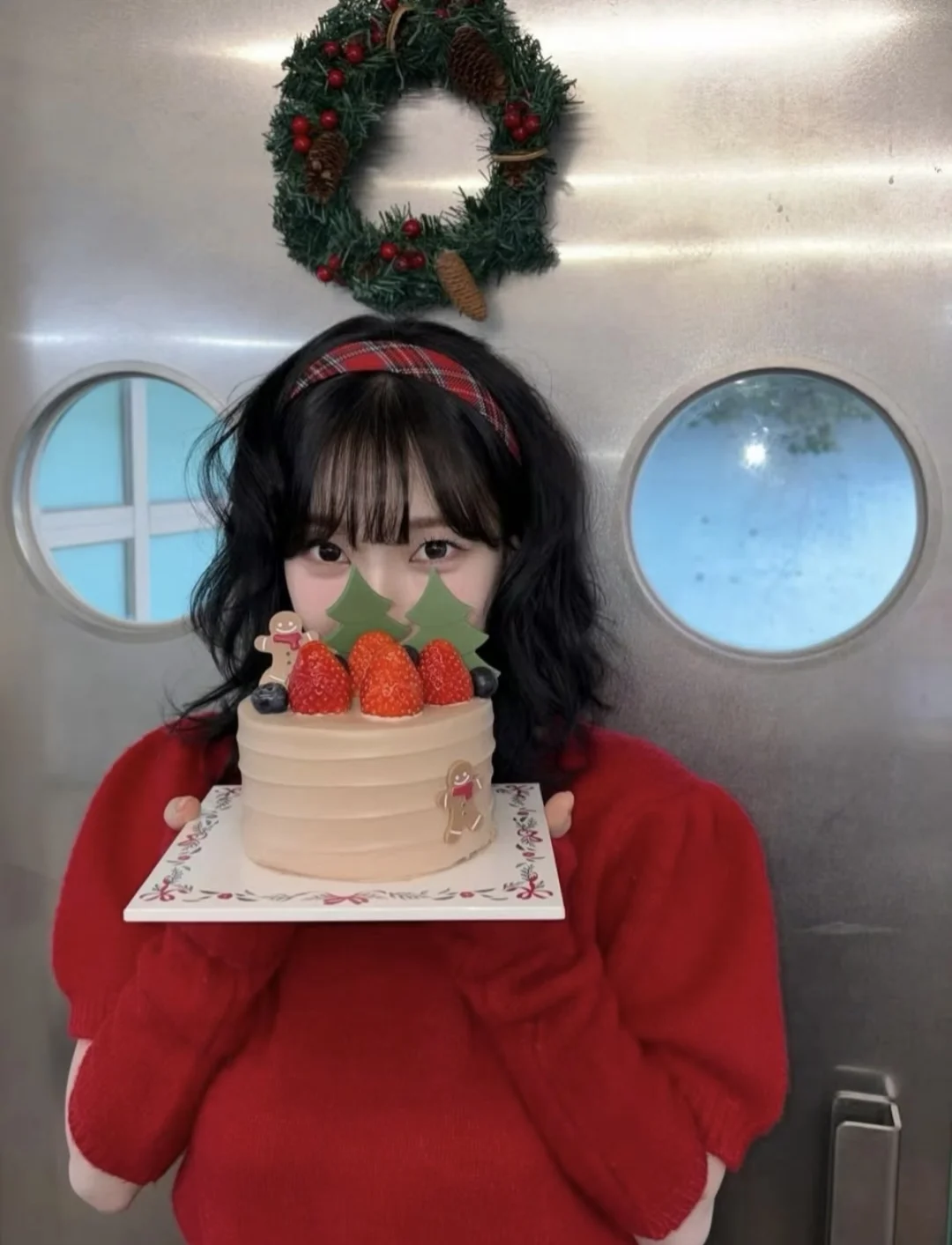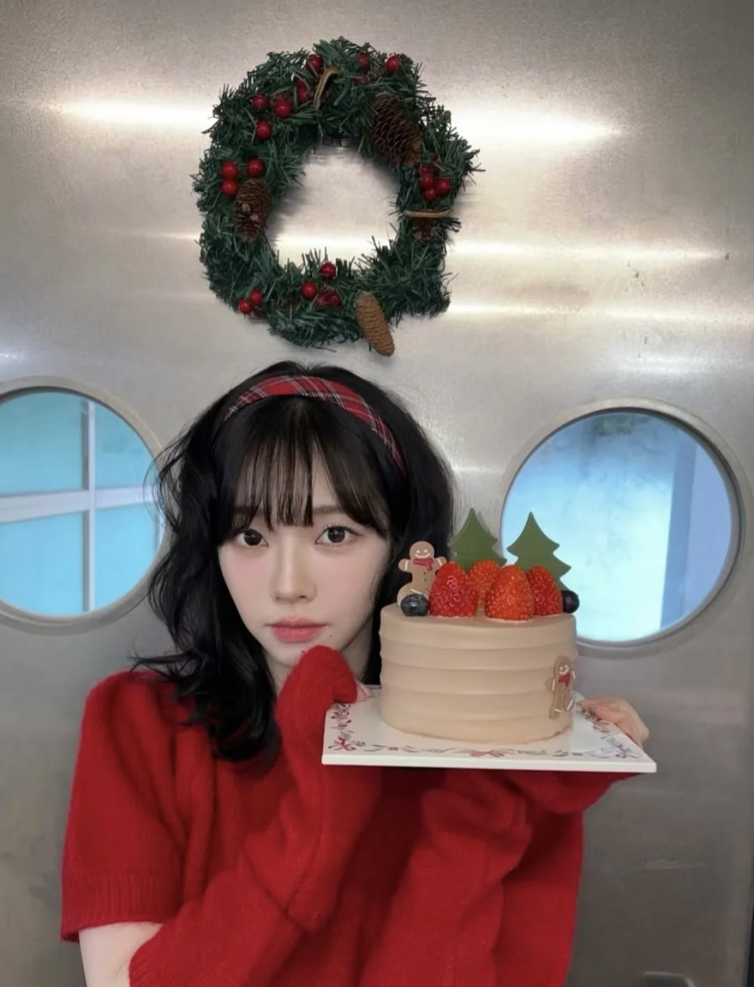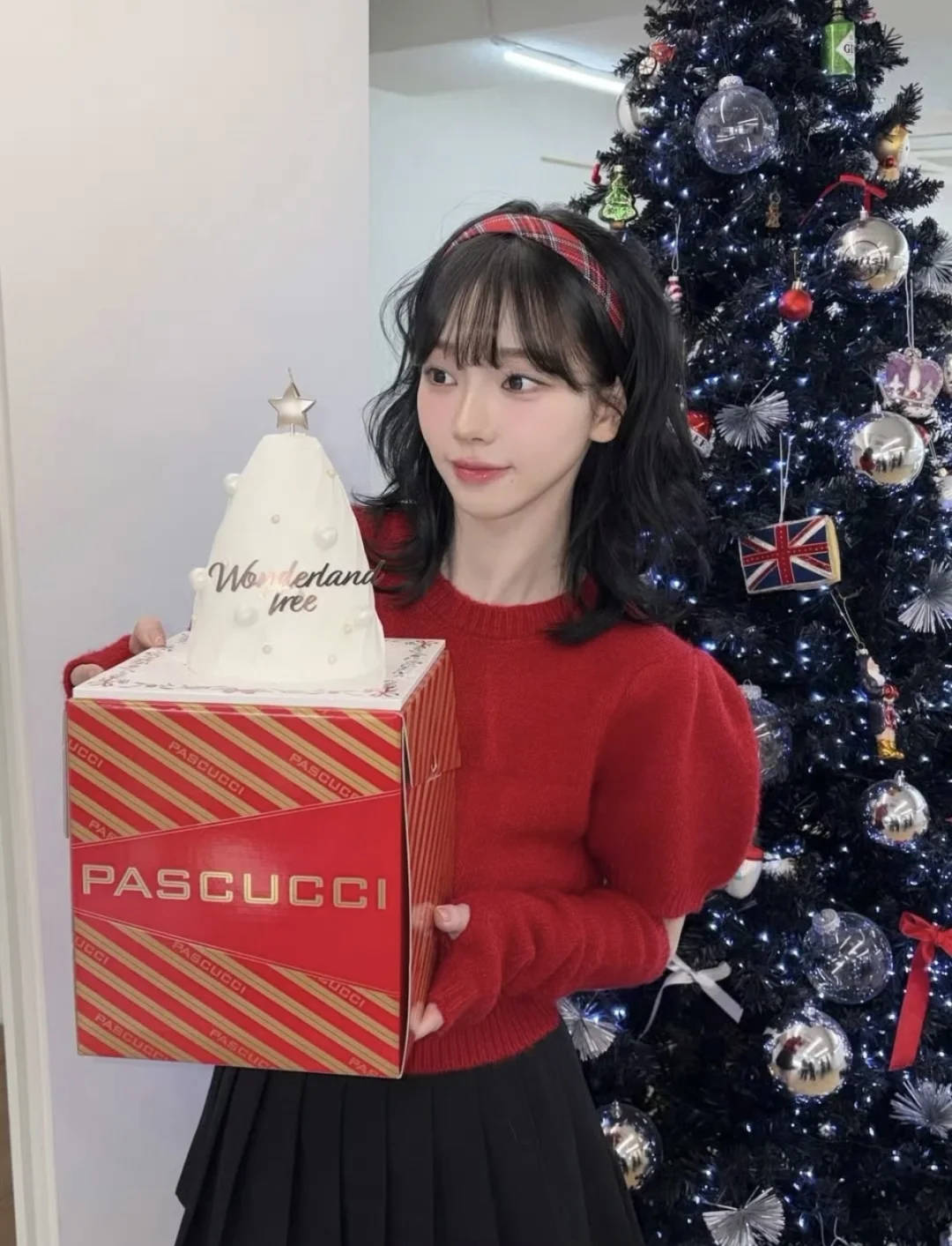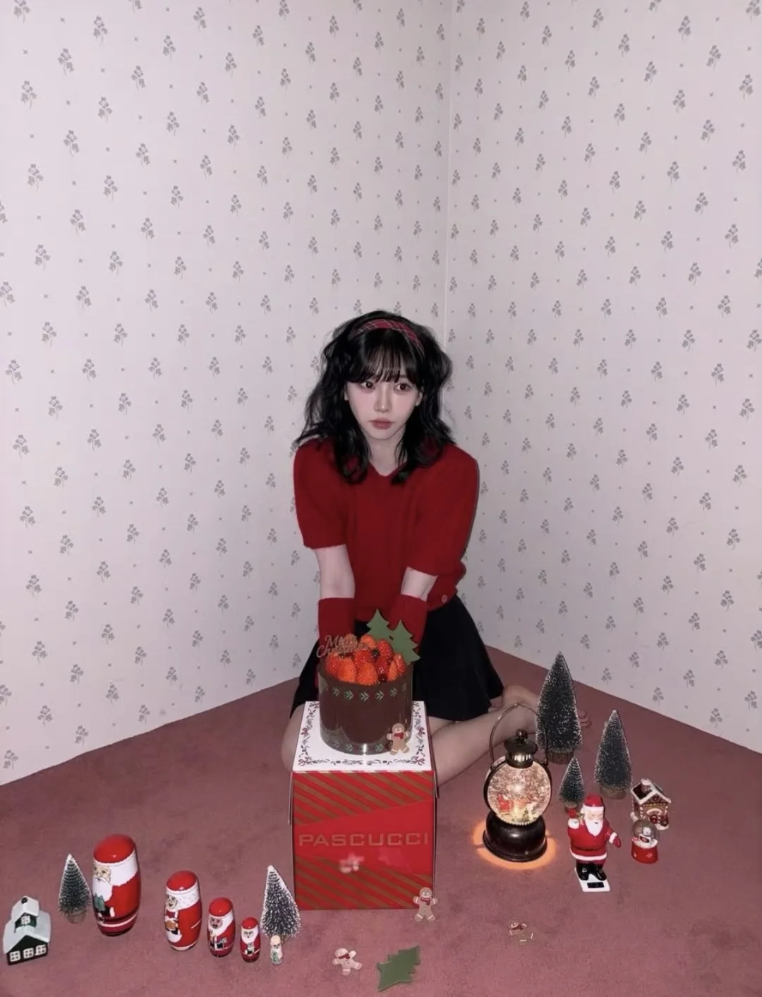 ▫️色彩思路:正红色短款针织衫作为视觉核心,圣诞氛围感拉满,搭配黑色短裙中和甜腻,甜酷平衡感拿捏 ▫️设计巧思:泡泡袖+袖套的分体设计超特别,露肤的同时增加层次感,不会让大面积红色显得臃肿 ▫️氛围加分:羊毛卷刘海+红色发箍呼应穿搭,和圣诞摆件同框直接封神