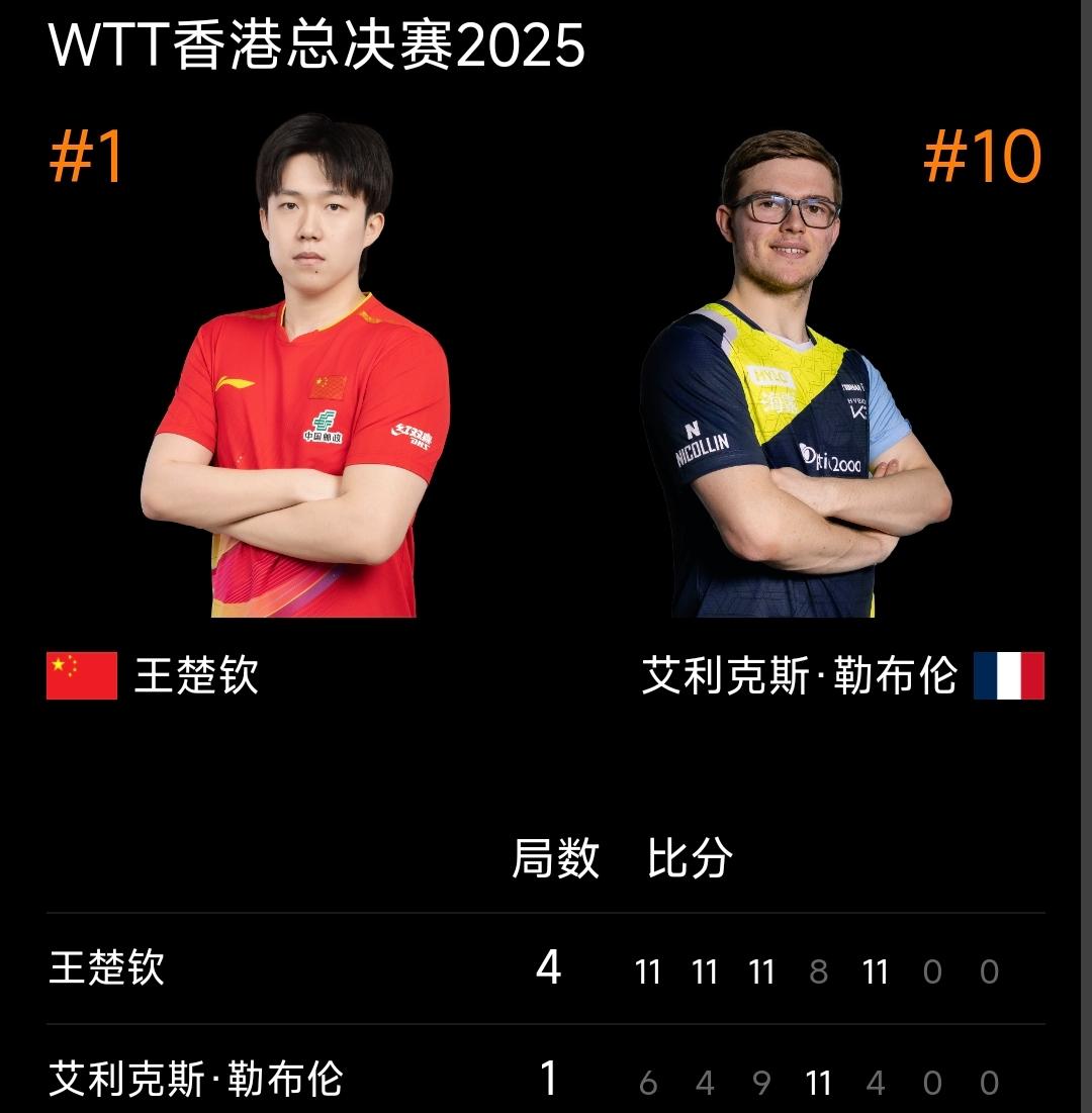 王楚钦4-1胜A.勒布伦晋级四强! WTT香港总决赛2025 男单四分之一决赛,头号种子国乒王楚钦以大比分4比1战胜了法国的艾利克斯.勒布伦顺利晋级四强! 在经历了首轮的惊险之后,王楚钦今天一上来发动很快,虽然勒布伦也能偶尔打出精彩球,但整体实力王楚钦占据上风,经过五局比拼,王楚钦大比分4比1胜出! 半决赛,王楚钦对阵莫雷高德与林昀儒之间的胜者!