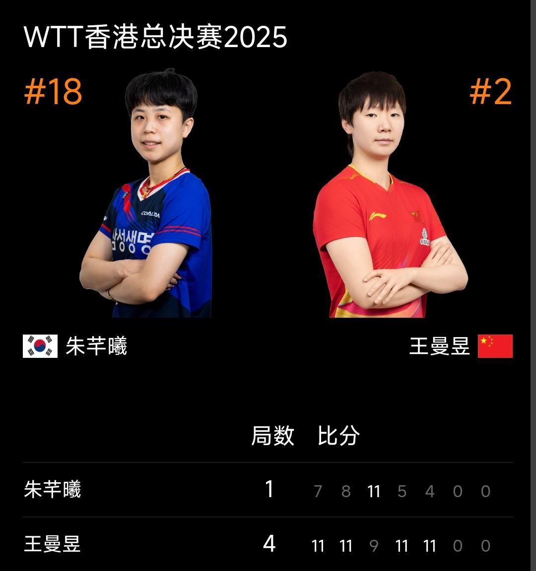 王曼昱4-1战胜朱芊曦晋级四强! WTT香港总决赛2025 女单四分之一决赛,二号种子国乒选手王曼昱以大比分4比1战胜韩国选手朱芊曦晋级四强! 王曼昱在正反手质量要高于朱芊曦,护台面积大,防守能力也很强,目前是女子顶尖高手之一。 半决赛,王曼昱将战陈熠,后者战胜了陈幸同晋级! 加油国乒!