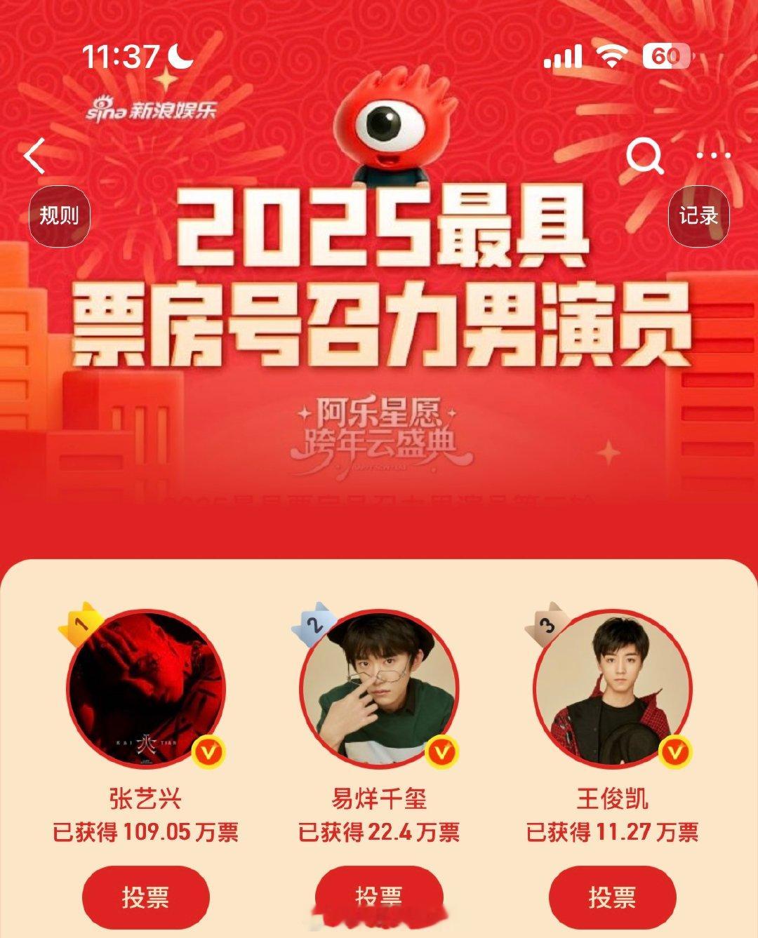 张艺兴影音人气双TOP 恭喜“最具票房号召力男演员”和“最燃音乐现场”现阶段双榜人气第一达成!2025年张艺兴作品硬实力也拉满了,不仅有《不说话的爱》,还有“大航海5·闹天宫巡回演唱会”,厉害!