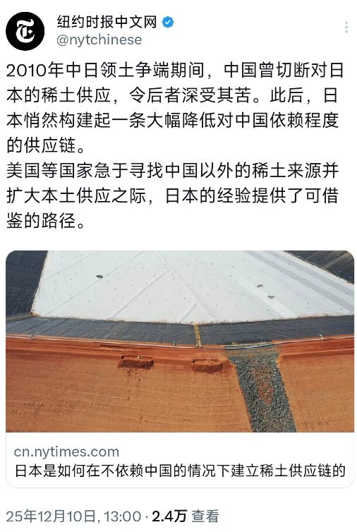 纽约时报中文网今天(12月10日)写道:“2010年中日领土争端期间,中国曾切断对日本的稀土供应,令后者深受其苦。此后,日本悄然构建起一条大幅降低对中国依赖程度的供应链。美国等国家急于寻找中国以外的稀土来源并扩大本土供应之际,日本经验提供了可借鉴的路径。” 2010年那记稀土断供的闷棍,让日本制造业至今脊梁骨发凉。当时丰田的采购主管冲进经产省办公室拍桌子:"再拿不到镝铁,下个月关东工厂就得停线。" 没人想到,这场持续三个月的断供,会成为日本长达十五年的供应链噩梦——从90%到60%的依赖度下降,每一个百分点都是真金白银堆出来的教训。 日本最先想到的是"找矿"。双日商社押注澳大利亚莱纳斯矿,三井物产钻进越南的红土镍矿,政府砸了10亿美元补贴,硬生生在南半球画出一条"澳洲挖矿-马来西亚提炼-日本加工"的曲线。 但这条链从一开始就透着脆弱:莱纳斯的稀土精矿运到马来西亚,光处理放射性废料的成本就比中国高四倍;马来西亚的环保抗议此起彼伏,2023年一场游行差点让工厂停工——这些环节里的每分钱,最后都摊到日本企业的成本里。 更致命的是"轻重之分"。日本能替代的只是轻稀土,像镨钕这种造电机的材料,澳洲矿还能凑数; 但重稀土里的镝铽,全球90%的产能还在中国手里。日立金属的工程师试过用其他元素替代,结果电机性能下降15%,车企根本不敢用。说白了,日本能买到的"备胎",都是中国看不上的边角料。 美国现在想学日本的"多元化",可15年前的旧账还没算完。当年日本官员求着美国分摊成本,华盛顿忙着页岩气革命,觉得稀土危机是"日本人自己的事"。 现在特朗普政府突然惊醒,砸4亿美元入股MP材料,却发现美国的稀土冶炼厂连熟练工人都凑不齐——科罗拉多矿业大学的教授说,全美国能玩转离子型稀土分离的工程师,一只手都数得过来。 中国的优势藏在产业链的褶皱里。从内蒙古的矿山到赣州的分离厂,再到宁波的磁材车间,这套体系磨合了三十年,每吨稀土的加工成本比美国低三分之二。 日本试过在马来西亚复制,结果环保设备的投资就超过中国整条产线。东京大学的冈部教授算过账:日本企业要完全摆脱中国,每年得多花200亿美元成本,这笔钱足够让丰田的混动汽车涨价15%。 最无奈的是"隐性依赖"。日本从澳大利亚进口的稀土精矿,有40%最后还是偷偷运到中国加工——因为只有中国能做到99.99%的纯度。 双日株式会社的植村社长承认:"我们买的是'干净矿',但干净的定义,是中国人说了算的。"这种拧巴的状态,让日本的"去中国化"变成了"绕中国化"。 现在美国带着盟友搞"矿产安全伙伴关系",号称要建"金属北约",可连澳大利亚都在打小算盘:莱纳斯的CEO去年坦言,他们70%的订单还是来自中国客户。 毕竟中国有全球最大的稀土交易市场,今天下单明天就能发货,这种市场流动性,不是签几个协议能复制的。 日本的十五年挣扎,说白了是给全球上了一课:稀土供应链不是拼谁矿多,而是拼谁能把污染、成本、技术揉成一个拳头。 当中国能用稀土永磁体的利润反哺开采环节,其他国家还在为环保罚款和电价发愁。这不是简单的"替代"问题,而是整个工业生态的较量——毕竟,谁都不想用造芯片的成本,去造电动车的电机。