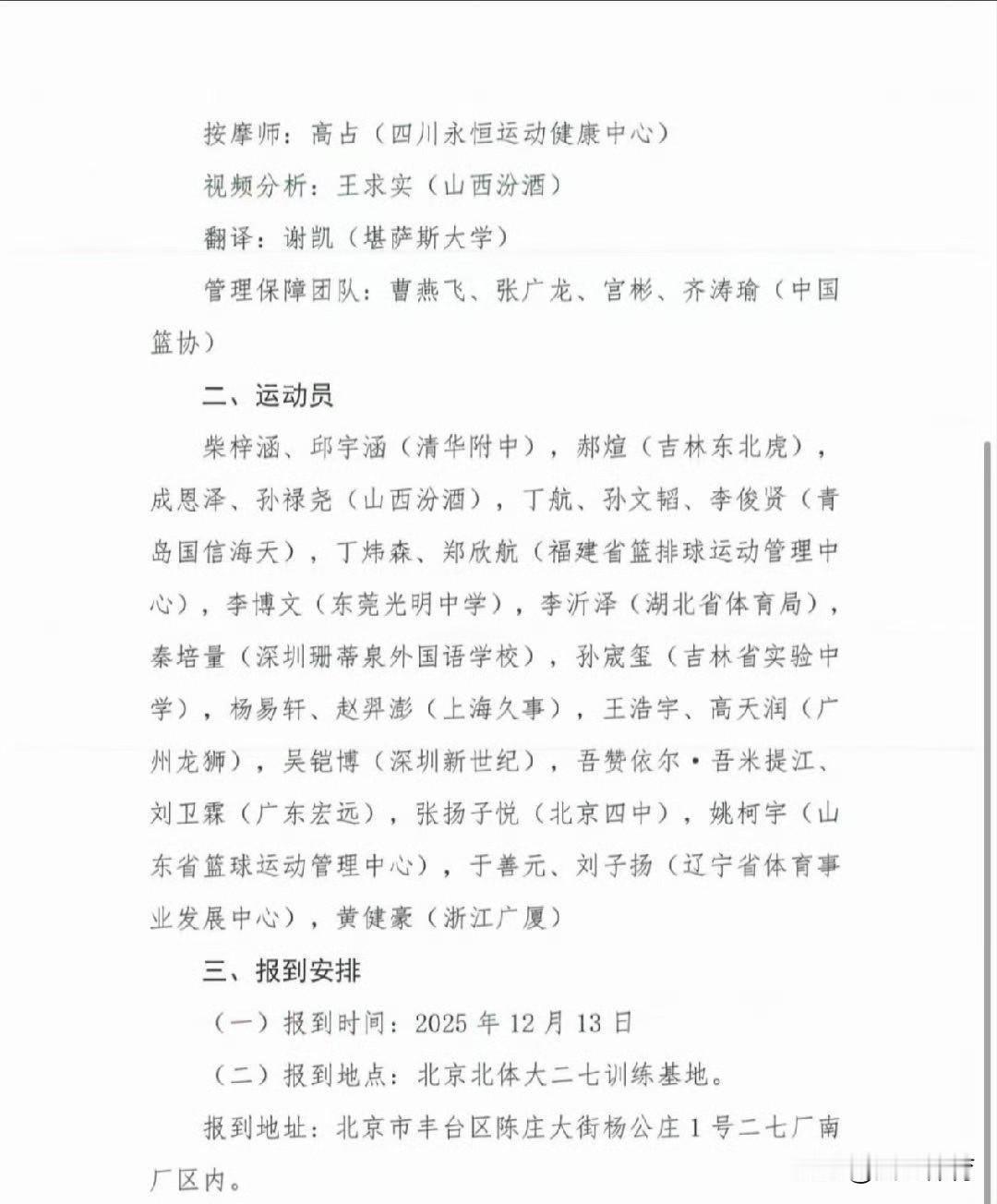 中国国青男篮冬训名单出炉! 北京时间12月12日,中国篮协公布了2025U18