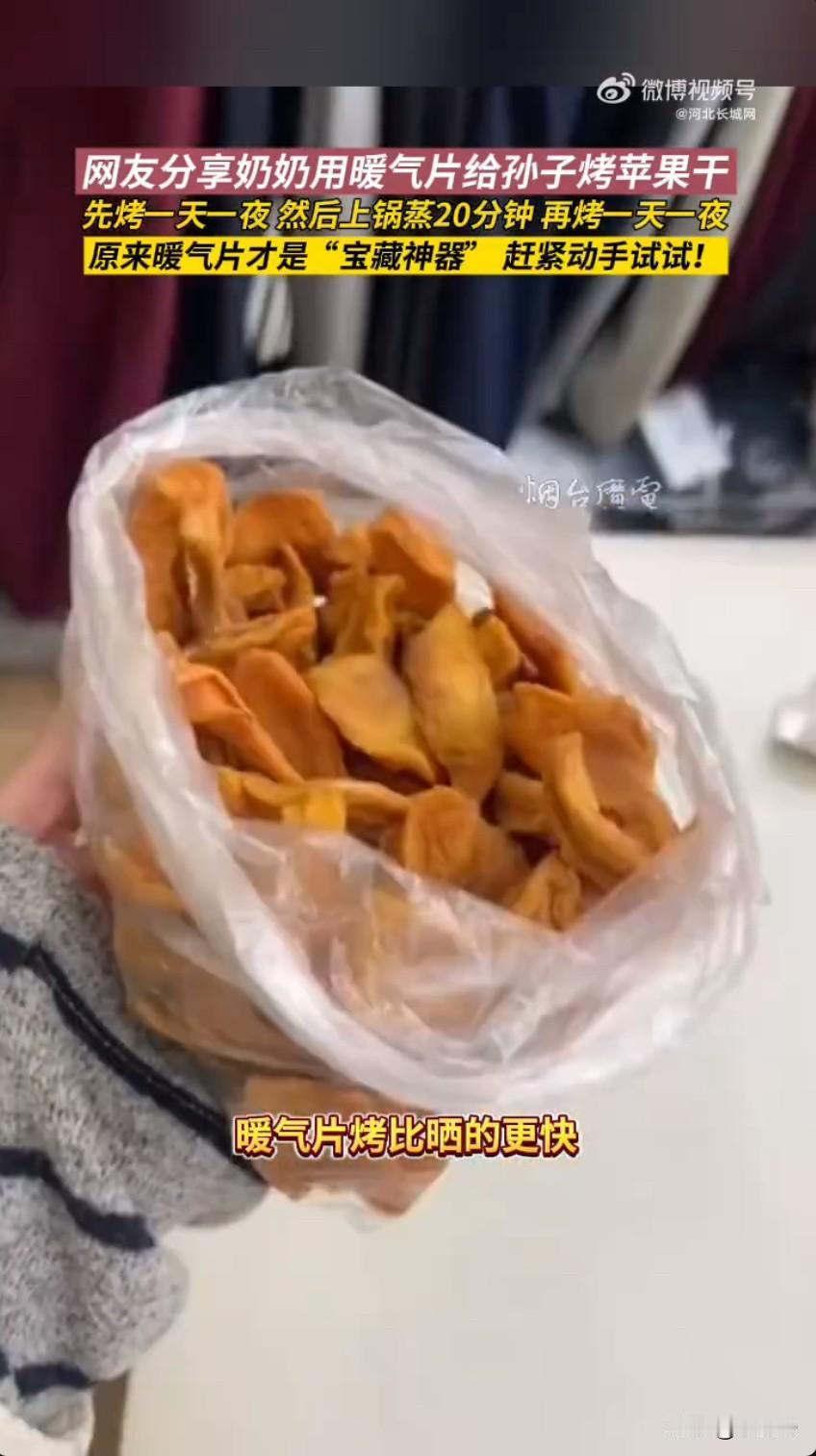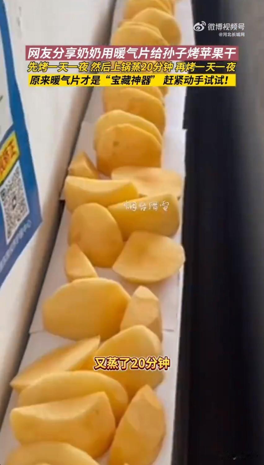山东烟台一位奶奶的操作,最近在网上暖爆了,大家看了都忍不住想起自己家的长辈。起因特别简单,小孙子想吃果脯,可奶奶总觉得外面卖的那些添加剂太多,吃着不放心,琢磨着自己给孩子做点儿健康的。正巧家里供暖了,暖气片热得烘烘的,奶奶一拍大腿就有了主意,用暖气片来烤苹果干,既不用费电,做出来还天然无添加。 奶奶做苹果干的步骤看着不复杂,但每一步都透着细心。先挑那种酸甜口、果肉紧实的新鲜苹果,洗干净后用食盐仔细搓掉表面的果蜡,去核切成两三毫米厚的均匀薄片,这样受热才均匀,不会有的烤焦有的没干透。接着在暖气片上铺上干净的纱布,把苹果片一片一片摆好,每片之间都留着缝隙,方便暖气流流通。就这么让苹果片在暖气片上慢慢烘,一天一夜下来,水分被收得差不多,苹果片变得半软半干,屋子里还飘着淡淡的清甜果香,小孙子总忍不住凑过去闻。 这还不算完,奶奶还有个关键步骤,把半干的苹果片放进锅里蒸二十分钟。这么一做,苹果的糖分能分布得更均匀,口感也会变得更软糯。蒸好后,再把苹果片放回暖气片上,继续烘一天一夜。等彻底做好的时候,苹果片已经变成了深琥珀色,摸起来干燥有弹性,咬一口甜而不腻,还带着点韧劲,比外面买的果脯还好吃。 这段视频一传到网上,立马引发了好多人的共鸣。网友们纷纷留言,说这就是童年的味道,自己奶奶也会用暖气片烤苹果干、烤红薯干,小时候放学回家第一件事就是去摸暖气片上的零食。大家都感慨,老一辈人太有生活智慧了,没有复杂的工具,却能把普通食材做出满满的幸福感,这暖气片根本就是宝藏神器。除了烤苹果干,网友们还分享了各种暖气片的隐藏用法,烤红薯、烘馒头、温牛奶,甚至还能烘干衣服、解冻食物,每一样都透着生活的烟火气。 其实这暖气片烤苹果干,不仅省钱省事,还能最大程度保留苹果的营养,没有额外添加,老人小孩都能放心吃。而最让人感动的,从来不是苹果干有多好吃,而是奶奶藏在里面的心意。从挑选苹果到切片烘烤,再到耐心等待两天两夜,每一步都满含着对孙子的疼爱。在物资丰富的现在,我们或许不缺各种零食,但这份藏在烟火气里的亲情与温暖,却格外珍贵,也难怪大家都说,暖气片烤出来的苹果干,是奶奶专属的甜。自制苹果干 原味苹果干 来源:河北长城网