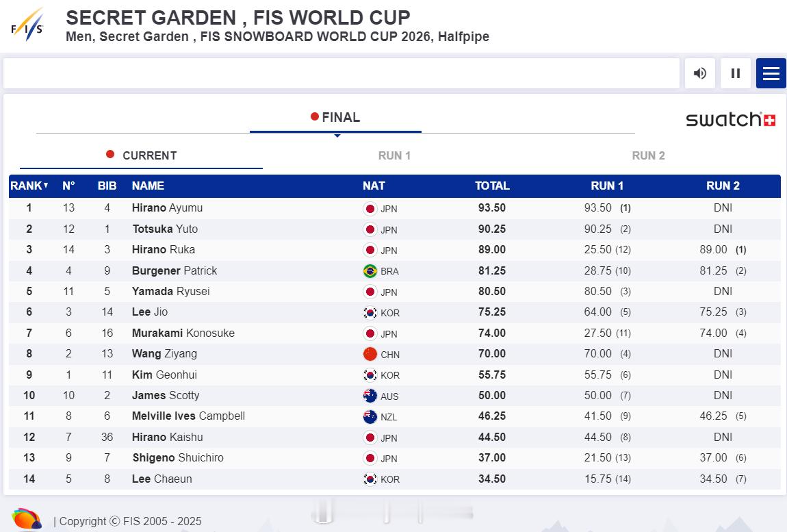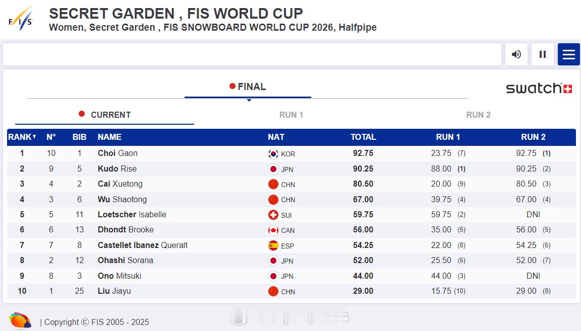 【单板滑雪世界杯U型池蔡雪桐摘铜】世界杯U型场地技巧蔡雪桐摘铜 12月12日张家口,单板滑雪U型池世界杯崇礼站结束。中国老将蔡雪桐以80.50分获得女子组铜牌,武绍桐和刘佳宇分列第四和第十。韩国崔佳温(Choi Gaon,音译)和日本工藤璃星分获冠亚军。日本选手平野步梦、户冢优斗和平野流佳包揽了男子组前三名,中国队王梓阳名列第八。
