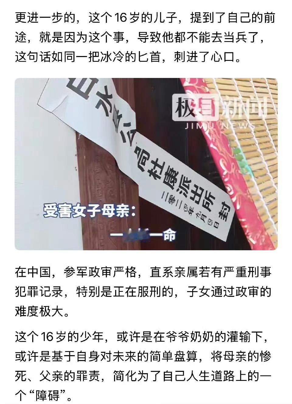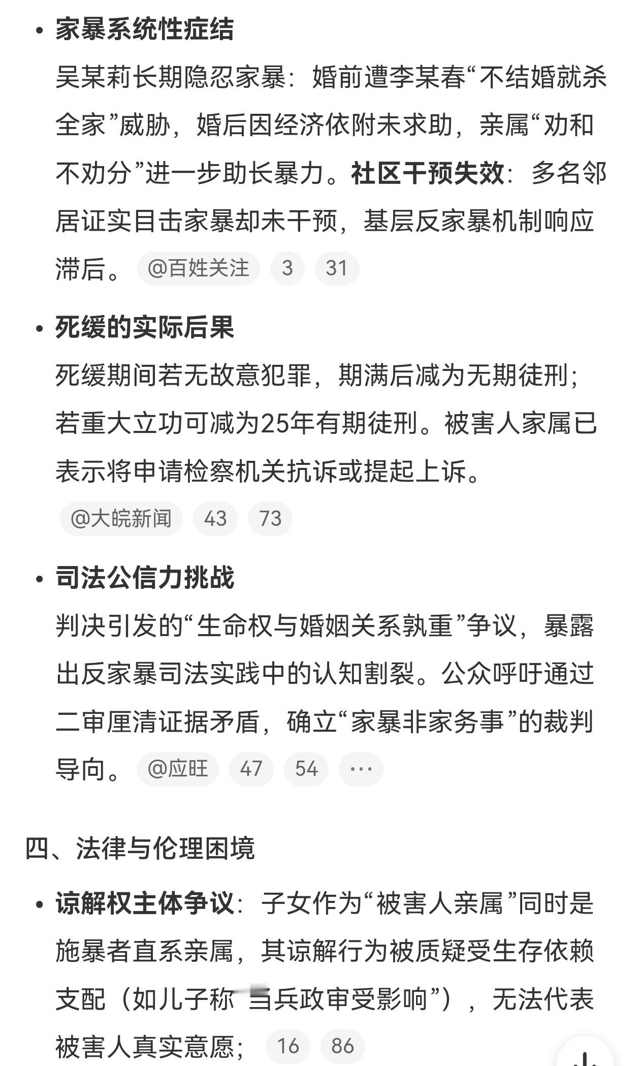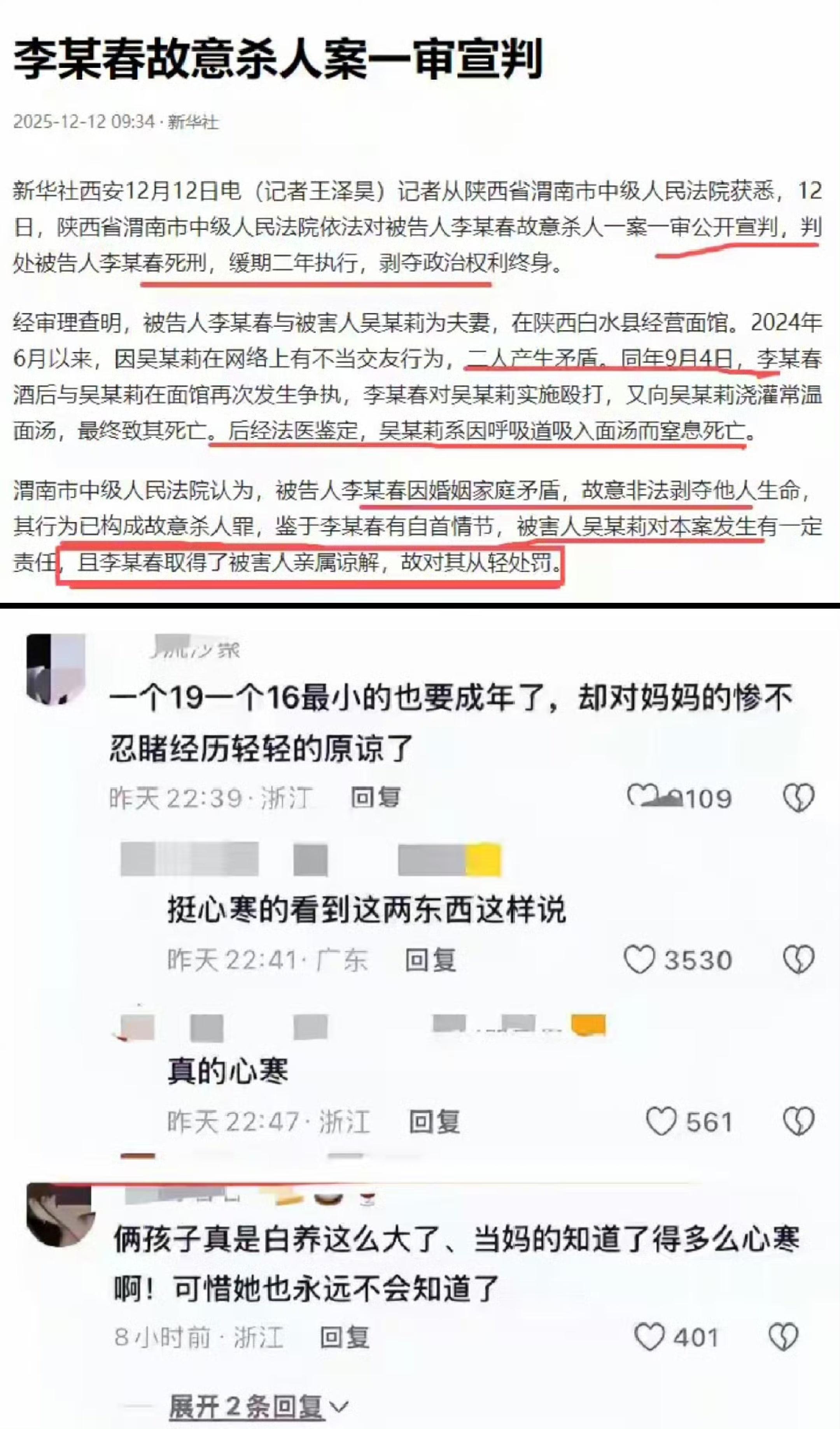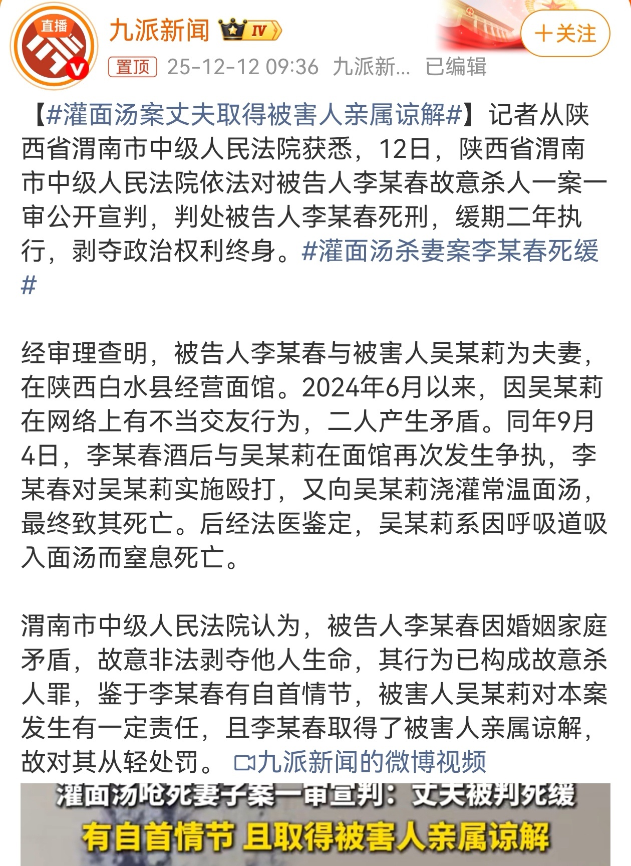 12月12日,“灌面汤杀妻案”一审宣判:被告人李某春因故意杀人罪被判处死刑,缓期二年执行,剥夺政治权利终身。法院认定,2024年9月4日,李某春酒后与妻子吴某莉在二人共同经营的面馆内发生争执,对吴实施殴打后,又将常温面汤灌入其口鼻,致其吸入性窒息死亡。灌面汤杀妻案李某春死缓灌面汤案丈夫取得被害人亲属谅解案发后,李某春自首,并取得被害人亲属出具的谅解书,法院据此对其从轻处罚。此外,吴某莉家属对法院“女方存在不当交友、对引发案件负有一定责任”的表述不予认可,称实际是男方出轨,希望还女方清白。有个细节是,在宣判前夜,吴某莉父母签署了谅解协议,谅解了灌面汤杀妻的李某春。李某春与吴某莉生育了两个孩子,女儿已成年并在外地打工,儿子案发时16岁,正在职校就读,目前正在应征入伍,因父亲犯罪记录导致政审受阻,希望获得社会“原谅”,但被害方家属强调“谅解”只用于量刑,不意味着对李某春行为的宽恕。希望大家多理解一下当事人,谁愿意经历父亲杀害母亲的悲剧,如今17岁的儿子担心政审影响当兵,本是受害者家属的他,同时还要承担加害者家属的政审影响,这一特别案例希望能被特别处理,既不影响子女后续的政审,同时严惩加害者。灌面汤杀妻案李某春死缓