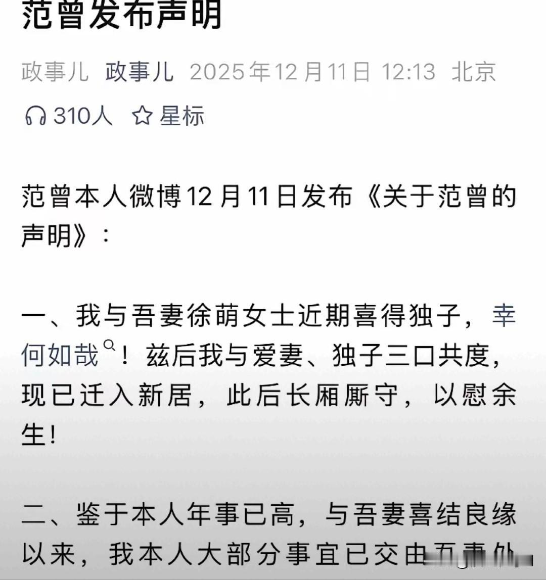 范曾家事闹得鸡飞狗跳,老底又被翻出来了。 这老爷子当年写《辞国声明》跑法国,结果混不下去,两年后灰溜溜回国,又发《归国声明》表忠心。现在八十多了,娶个小娇妻还闹财产纠纷,前妻出来爆料,儿女争遗产打得头破血流。 圈里人都知道,范曾这类艺术家最爱玩双标。嘴上吹国外自由,身子却赖在国内不走。为啥?在国外没人买账,作品卖不出价,回来还能顶着"大师"名号捞金。 最新进展是,范曾工作室发声明称"家务事不回应",但网友扒出他近年作品价格跳水,拍卖行都不愿接单。艺术圈内幕说,现在藏家都学精了,不吃"爱国画家"那套了。 要我说,这出戏就像过期罐头,看着光鲜,一打开全是馊味。 评论区聊聊:这种"两面派"艺术家,到底图啥?