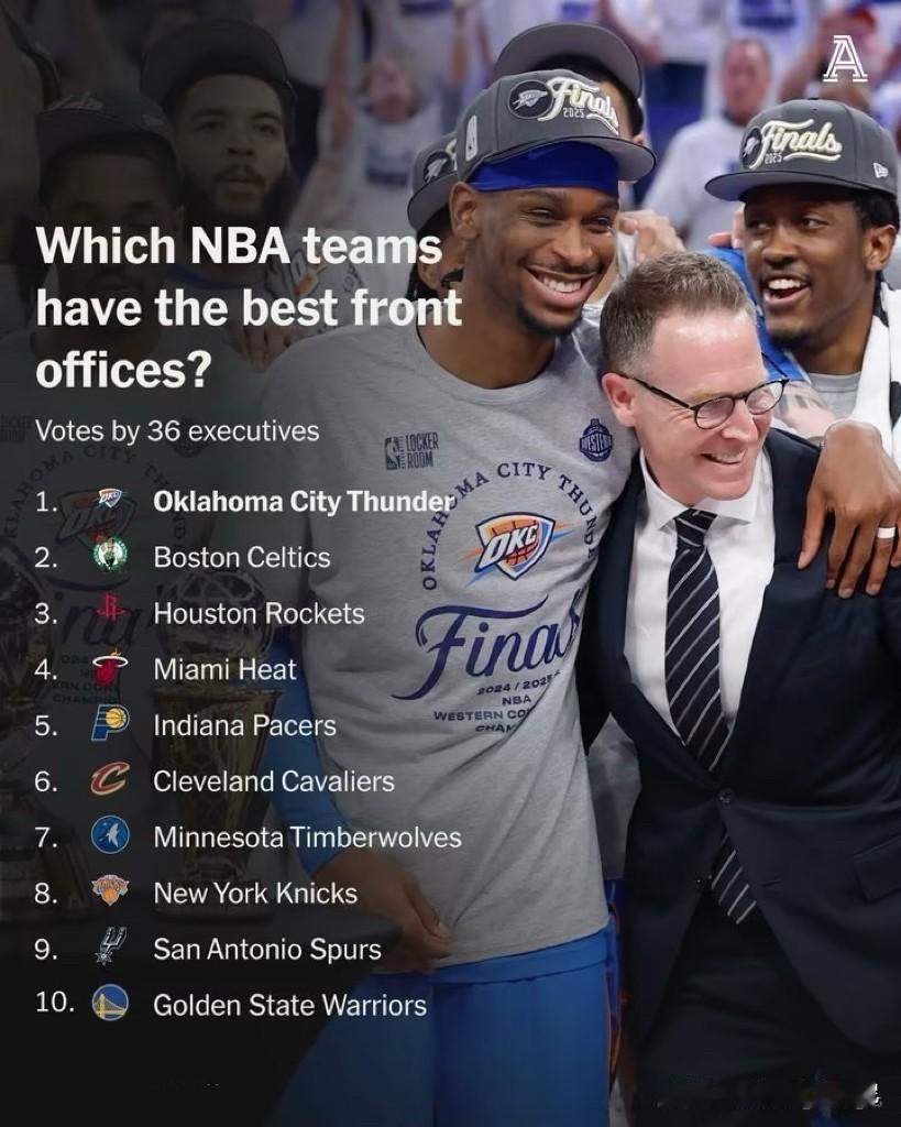 NBA现役36位球队高管投票评选出联盟10大最佳管理层。 雷霆后来居上排名第一,用曾经的雷霆三少,通过多次交易逐步兑换成如今的王者之师。 勇士迅速坠落,在韦斯特、迈尔斯相继离开之后,勇士的管理层再无神奇表现,选人、交易都一言难尽,不过仍然排名第十。 波士顿绿军、休斯顿火箭排名第二、第三;每个赛季交易最多的湖人上不了榜。[吃瓜群众][吃瓜群众]