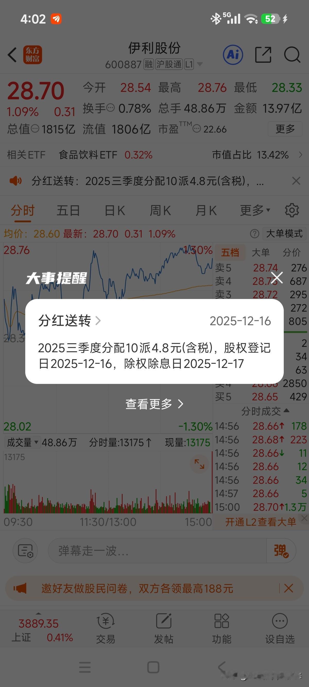 今天上涨1.09%,终结了日线的八连阴!下周二晚间中期股息就能到账! 24年四季度伊利股份利润基数低,主要是做了商誉减值,25年四季度同比大幅提升是确定性,净利润创新高,全年股息同步再创新高也是大概率事件! 估值上目前算合理,股息到手继续复投!希望能有个好位置[呲牙]!