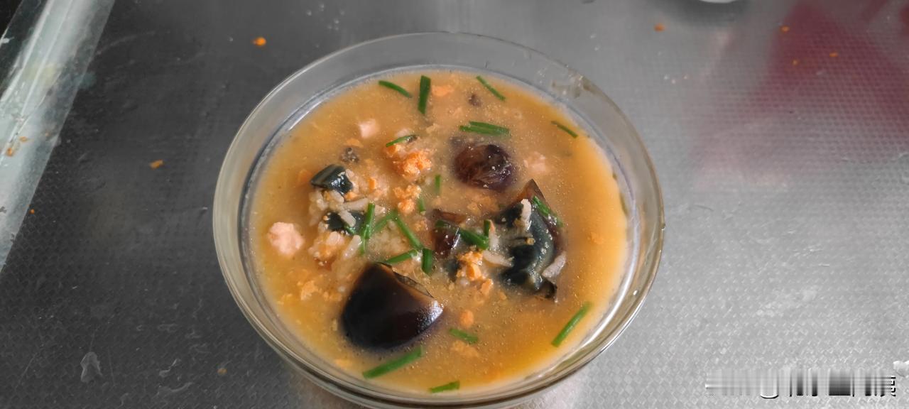 今天我熬了一锅海鲜粥。配料有大米、皮蛋、三文鱼、海胆黄和香菇,临出锅撒了小葱和少许香油。