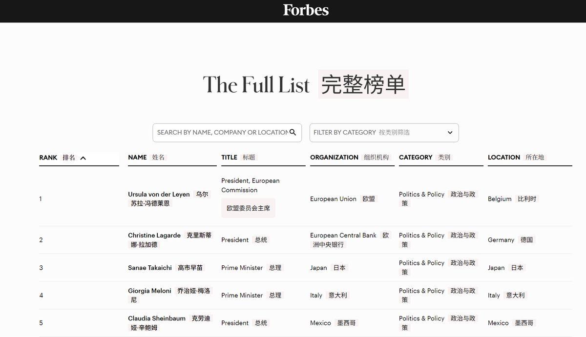 美媒评选“年度百大影响力女性”,高市早苗竟然名列前茅,果然,德意日轴心国合流。 12月10日,美国《福布斯》杂志发布了本年度的“全球百位最具影响力女性”榜单。 这份榜单的评选标准看似客观,涵盖了财富、媒体曝光度与影响力范围等多个维度。 然而,细看榜单前几位的政治人物,却能嗅出一丝不同寻常的气息。 这份榜单与其说是在表彰女性力量,不如说更像是一份美国的政治风向标,充满了精心设计的布局与暗示。 排在榜首的是欧盟委员会主席、德国人冯德莱恩。她连任后,几乎所有动作都与美国的全球战略严丝合缝。 从主导对俄制裁,到推动冻结俄罗斯资产,再到那项高达1050亿美元的对乌援助计划。 客观来看,冯德莱恩手握欧盟行政大权,确实影响力巨大。 她推动的8000亿欧元欧盟共同防务计划,以及“AI大陆行动计划”,都深刻影响着欧洲未来的走向,将她列入榜单无可厚非。 但问题在于,她的影响力究竟是为欧洲服务,还是为美国服务?她推动的政策在欧盟内部早已引发巨大争议。 就在今年10月,她还险些因激进的援乌政策,遭到欧洲议会部分议员发起的不信任动议。 紧随其后的是欧洲央行行长拉加德,她同样是冻结俄罗斯在欧资产的关键执行者。 再往下看,意大利总理梅洛尼位列第四,其在对华政策上几乎是美国的“复读机”,亦步亦趋地跟随华盛顿的强硬立场。 最令人玩味的,是排名第三的日本新任首相高市早苗。她的上榜,让这份榜单的政治意图彻底暴露无遗。 当德国、意大利、日本三国的领导人同时出现在前五名时,历史的阴影便悄然浮现。 2025年,恰逢第二次世界大战结束80周年。 在这个极具象征意义的年份,德、意、日这三个前“轴心国”的女性领导人,被一份美国主流媒体的榜单高高捧起,这绝非偶然。 这背后,是美国试图构建新“价值观同盟”的清晰信号。 它似乎在告诉世界,旧的阵营正在以新的面孔重新集结,而这份榜单,就是它们吹响的集结号。 高市早苗的上榜,尤其具有讽刺意味。她作为日本首位女首相,本应是女性赋权的象征。 然而,她的所作所为却与“进步”二字背道而驰,反而更像是一个彻头彻尾的“美国代理人”。 她的影响力,更多体现在“负面影响”上。 她不仅质疑“村山谈话”,频繁参拜靖国神社,大搞历史修正主义,更是在现实政治中不断挑起事端,破坏地区稳定。 就在上个月,高市早苗在国会公然宣称,“台湾有事可能触发日本的存亡危机”。 这种为美国“印太战略”火中取栗的言论,立即引发了中方的严正抗议。 更离谱的是,她在访问马来西亚期间,竟向二战日军的“慰灵碑”献花,此举瞬间激怒了曾饱受日本侵略之苦的整个东南亚。 她的影响力,正在将日本拖入危险的深渊。 这种倒行逆施,不仅在国际上引发轩然大波,在日本国内也激起了强烈反对。 民众抗议要求其下台的声浪此起彼伏,就连自民党内部元老、前首相鸠山由纪夫都公开指责其言论“愚蠢至极”。 高市早苗的个人行径也备受诟病。 在APEC、G20等国际峰会上,她与男性领导人之间不得体的“勾肩搭背”,被媒体讽刺为如同“银座妈妈桑”,严重损害了日本的国家形象。 不排除这正是美国所乐见的。一个听话但又充满争议的日本领导人,最符合美国在亚太地区的利益。 她越是挑衅,就越能将日本更紧地捆绑在美国的战车上。 回看榜单上的其他人,冯德莱恩在欧盟内部早已被讥讽为“美国的传声筒”。 她强行推动的对俄制裁,无视了匈牙利等成员国的激烈反对,欧盟内部的裂痕正在因此加深。 就在昨天,欧盟理事会刚刚批准向乌克兰支付第六笔23亿欧元的援助。 冯德莱恩的“影响力”正在持续消耗欧洲的元气,以满足大西洋彼岸的战略需求。 更有趣的是,榜单上还有墨西哥新任总统辛鲍姆。 她计划对包括中国在内的多国商品加征5%至50%的关税,这显然是在呼应美国的贸易保护主义政策。 中方已明确回应,这种做法“损人不利己”。 这份榜单看似在赞美女性,实则是在为一种特定的“影响力”背书。 这种影响力并非致力于合作与发展,而是服务于对抗和分裂,其本质是新时代的“轴心国合流”。 讽刺的是,当《福布斯》将德、意、日领导人捧上高位时,美国政府却在酝酿组建一个排除欧盟的“核心五国”(美、中、俄、印、日)新机制。 这种矛盾做法,暴露了美国实用主义外交的虚伪本质。