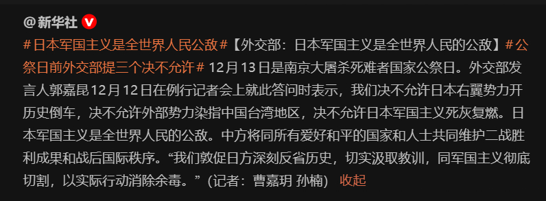 🔻外交部:日本军国主义是全世界人民的公敌。🔻目前,高市早苗政权所有的挣扎都没有达到效果。白宫回应中日冲突后日本失望日本仍有人公然说南京大屠杀是造谣热点现场海外新鲜事