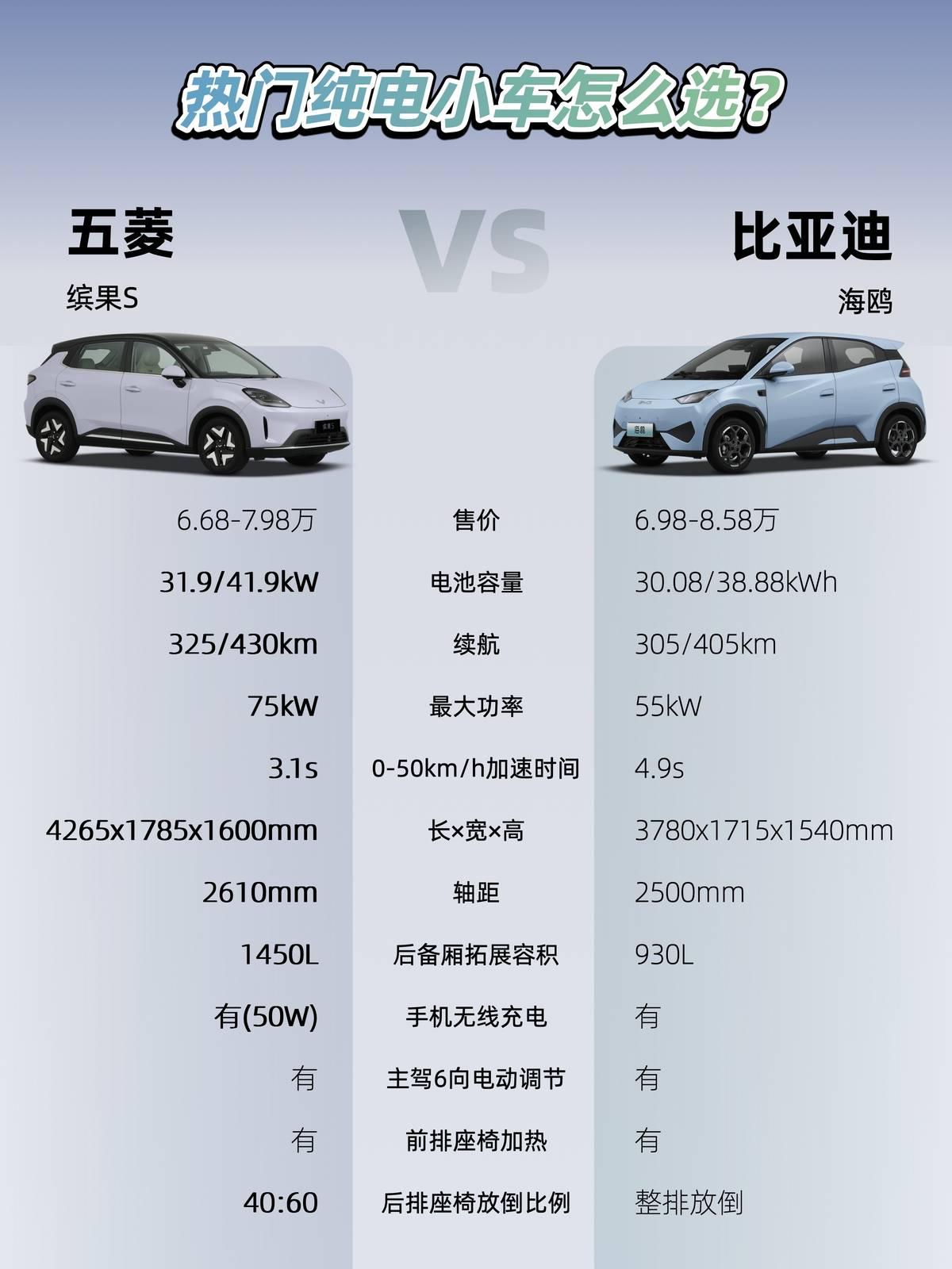 6-8万预算买纯电,缤果S还是比亚迪海鸥? 虽然从尺寸来看,缤果S要比海鸥大一圈,但有很多年轻朋友在这两款车之间做选择,那我就从续航,配置以及空间等多方面来对比一下。 先说续航,海鸥的续航有305km和405km两种,顶配的405km飞翔版需要8.58万元;缤果S提供325km和430km两种续航,6.98万就能买到430km的续航,而且6.38万起的缤果S全系标配75kW电机,最大扭矩180牛·米,相比海鸥55kW电机和135牛·米的扭矩更有优势。 再看配置,海鸥的配置也比较丰富,但很多配置都是高配车型才有,入门级配置表现一般。而缤果S不仅全系标配50W无线充、6扬声器、4安全气囊以及无感进入等高价值配置,还有8.88英寸全液晶仪表屏和12.8英寸2K高清中控屏,更有融合DeepSeek的智能AI车机,这入门即高配的水准可是同级标杆。 最后说空间,缤果S尺寸更大,2610mm的轴距也比海鸥2500mm的轴距多出很多,整体的乘坐舒适性和宽敞度更好。另外,缤果S后排座椅可以4/6分折放倒,下沉式后备箱设计可以带来最大1450L后备厢容积,海鸥的后排座椅只能整体放倒,后备箱最大拓展容积仅为930L,很明显缤果S的储物能力更强。 虽然两款车型价格同区间,但缤果S的产品力更有优势,所以缤果S才是超值之选!