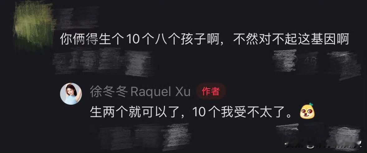 娱乐圈的人开始聊生娃话题了,45岁张柏芝还想再生孩子,声称要生到不能生为止,但是她这个年纪若是绝经,受孕生孩子几率很低,相反,年仅35岁的徐冬冬却说她最多只想生两个孩子,尽管网友让她生十个。 张柏芝参加综艺透露自己的梦想就是生孩子,成家做母亲,哪怕不结婚也想生孩子,坦言要生到不能生为止,语音刚落,却惊掉旁人的下巴,但是她却心安理得,因为她真的爱孩子顾家庭。 据悉,张柏芝已经结婚20年,和谢霆锋结婚在一起5年,生了三个孩子,且都是男孩,在此之前她有包括陈冠希陈晓东陈小春在内的4任男友。 而徐冬冬未婚,但是有未婚夫尹子维,两人暂时没有结婚,也没有生孩子。 依我看,是否要生孩子,应该生多少孩子,是女人说了算,这受经济基础影响,也受对孩子偏爱程度影响,纵观古今,除了受传统观念影响,为了绵延子嗣,为了生一个男孩,大多经济条件好的喜欢小孩的人都喜欢生孩子,显然,张柏芝两个因素都具备,这也难怪她喜欢生孩子。