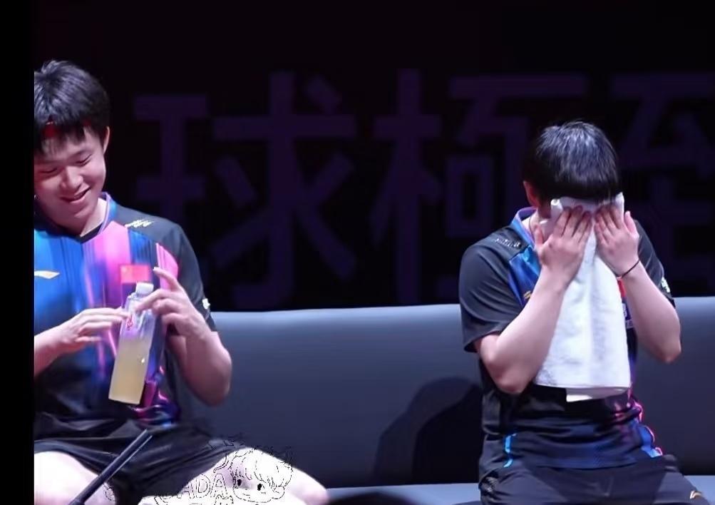 世界上最凶残的扣杀,原来能被打成撒娇。 你看见过孙颖莎捂脸笑吗? 不是礼貌微笑,是那种用白毛巾整个盖住脸,身体却笑得发抖,酒窝的弧度从毛巾边缘钻出来的笑。 搭档王楚钦在旁边一挑眉,全场就懂了。 他们是WTT冠军赛上让对手头疼的“莎头组合”,也是训练馆里互相调侃的“大头”和“莎莎”。 球网一侧,他们是计算旋转变线的天才;球网另一侧,一个捂脸偷笑,一个歪头得意,瞬间变回两个00后小孩。 国乒混双的未来压在他们肩上。 他们接住的方式很特别:用绝对专注拿下赛点,再用绝对鲜活面对彼此。 那种默契,不需要语言,一个眼神就知道是打偷袭还是放高球。 冷面扣杀是他们的武器,捂脸偷笑是他们的暗号。 他们不是在打球,是在写一首给青春的长诗。