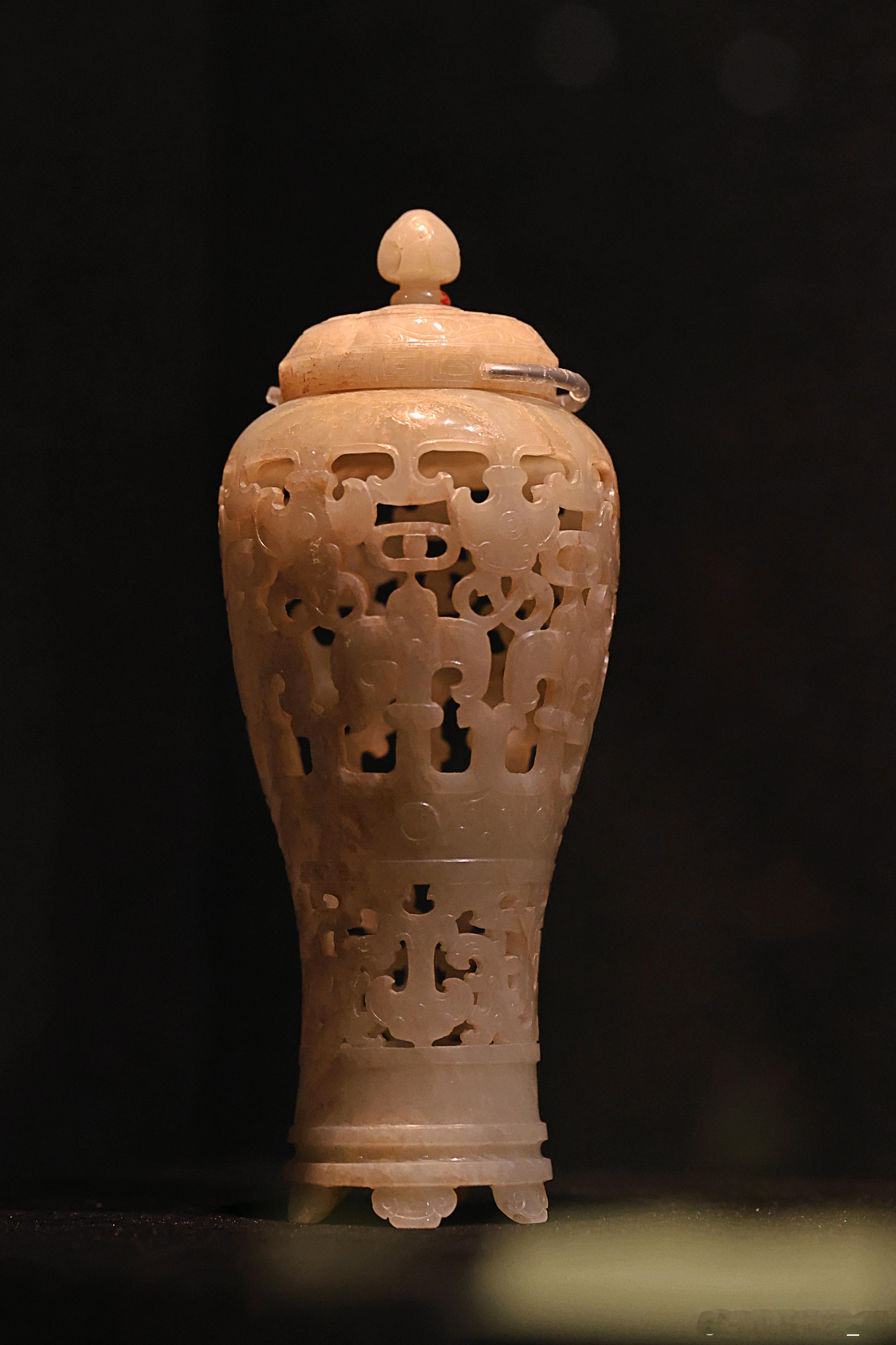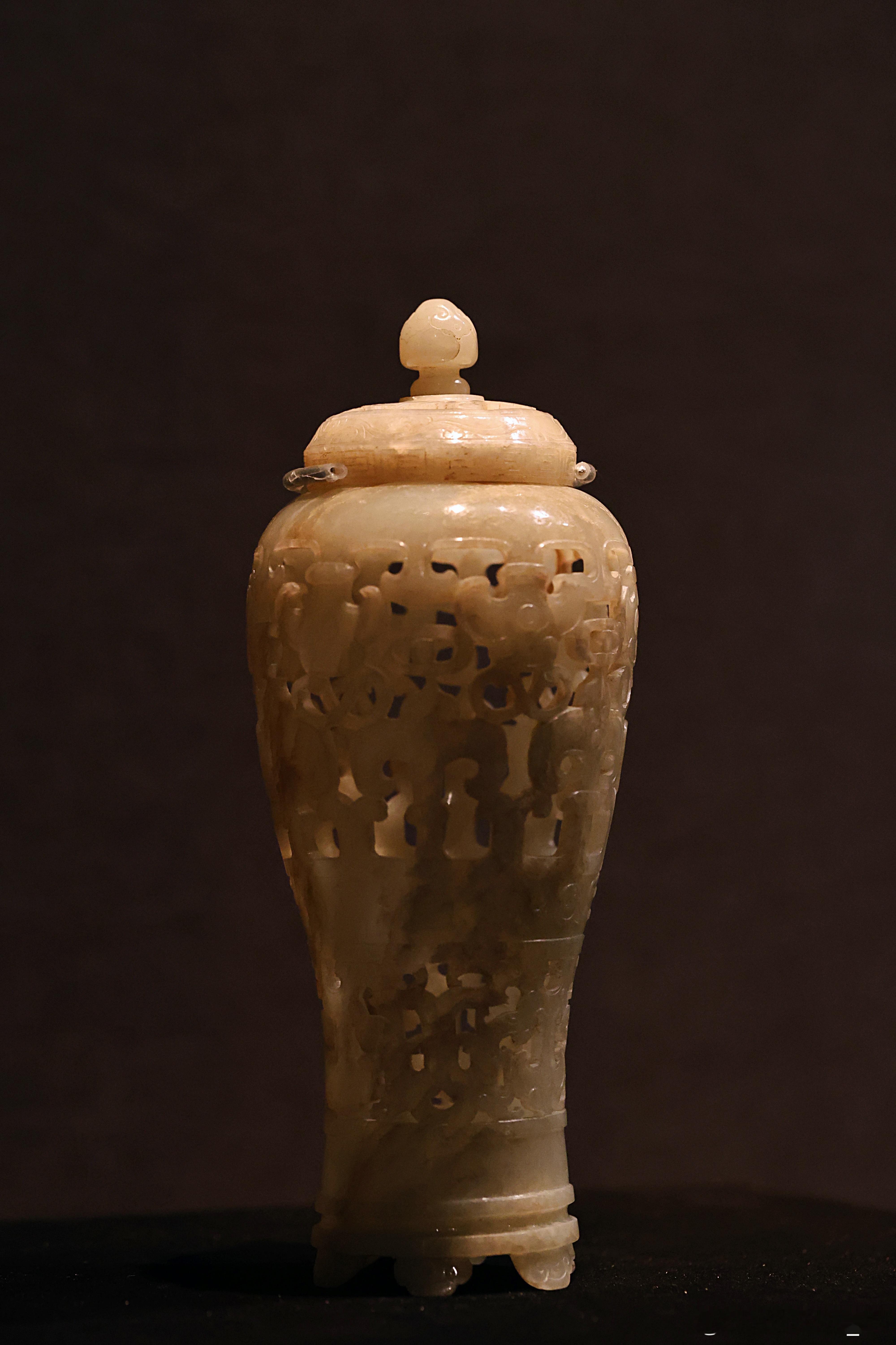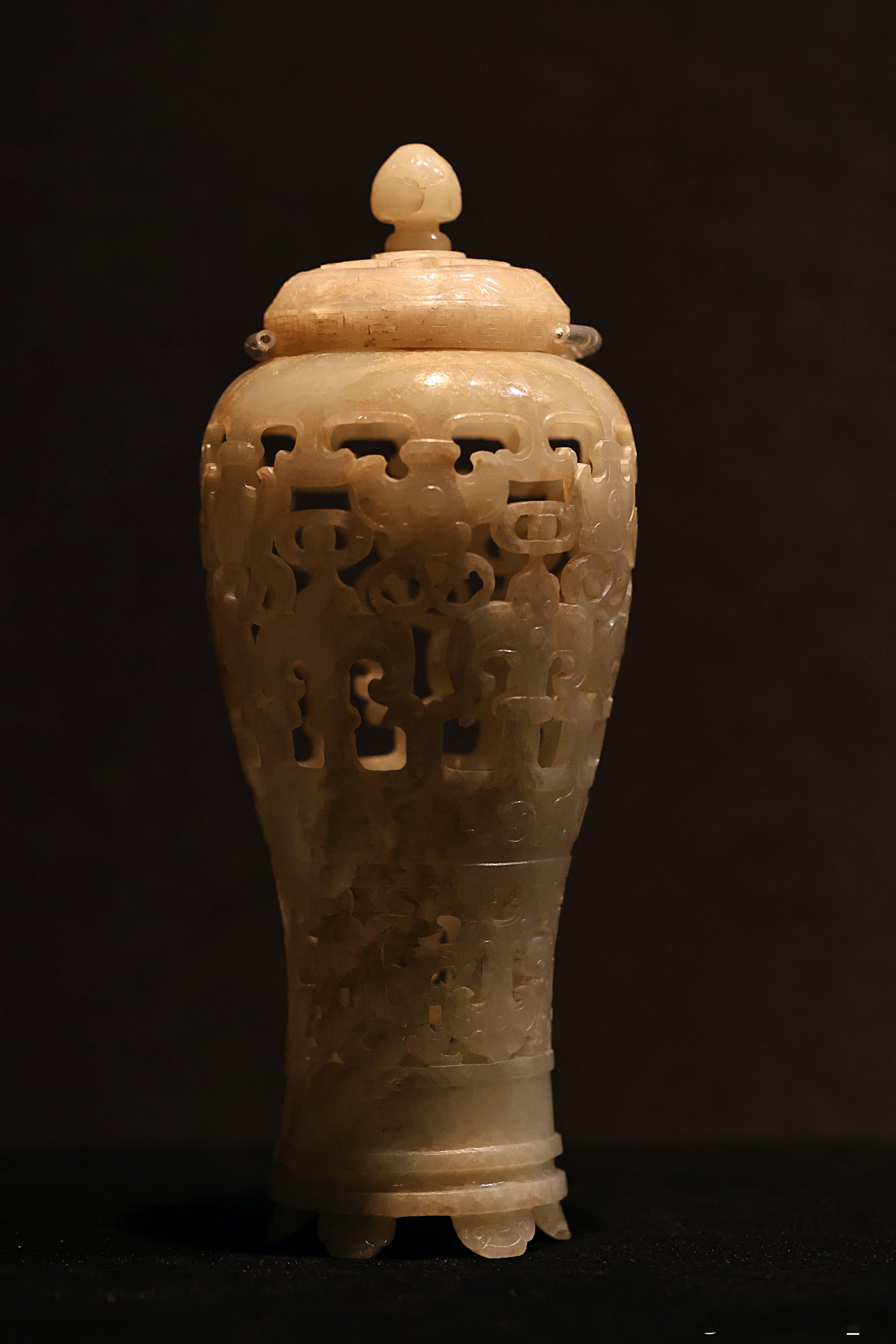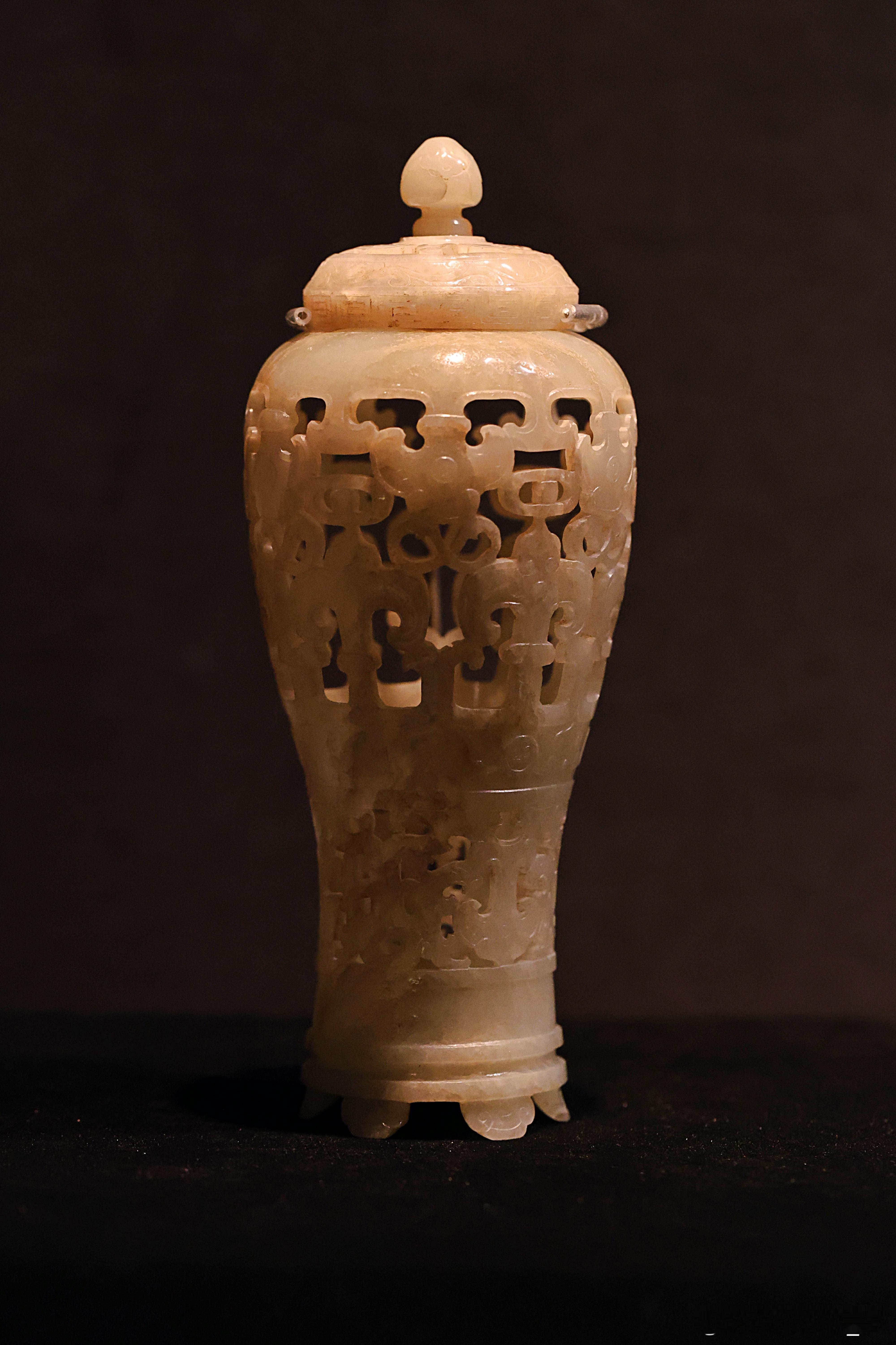 青白玉如意云纹盖瓶 明 (1368-1644)首都博物馆藏 北京密云董各庄清皇子墓出土。玉瓶通体镂雕如意云纹,底部有两道阳起的弦纹,平底,下以六个微微外撇的云头作足,内壁光滑,盖与钮分别碾琢,有极好的玻璃光。