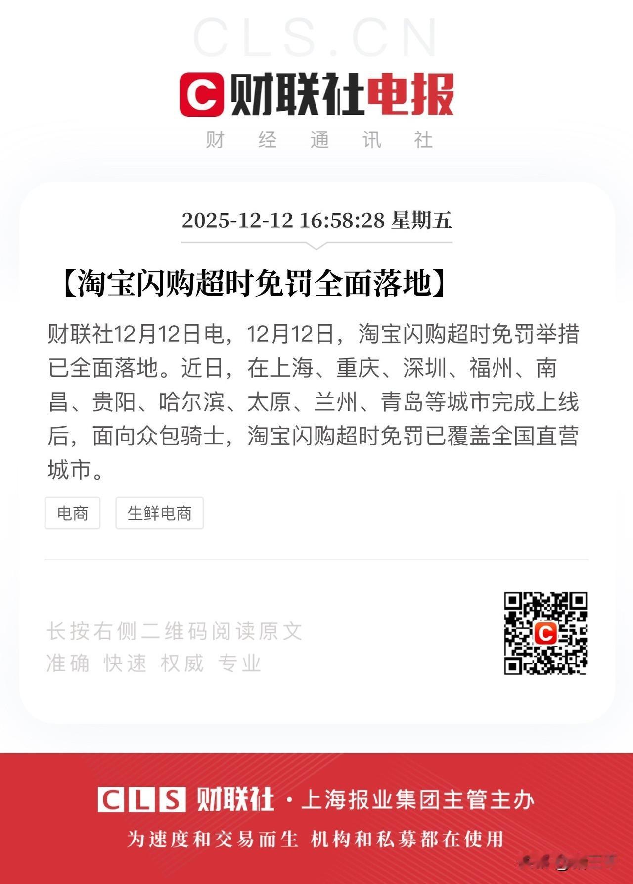 骑手福音! 淘宝闪购超时免罚, 为了响应电动车新国标25码限速。 但随之而来的是新问题, 派单单价不提升的话, 骑手每天的派单量大缩水, 那么收入可想而知也是大缩水。 超时免罚杯水车薪! 市区内又不让跑电摩, 那么各大餐饮电商平台可能最好的方式是, 外卖集中站点无人机配送。 大幅缩减用工情景真的好吗? 可能失去配送员的工作机会, 最终大浪淘沙留下来的只能是口碑小炒和厨子? …