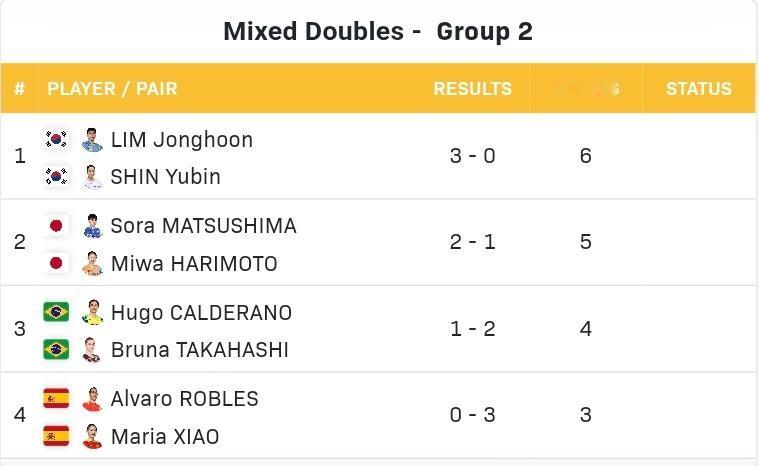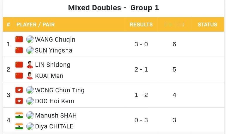 混双四强产生:国乒两对组合晋级! WTT香港总决赛2025 混双小组赛结束,第一组比赛结果: 1️⃣王楚钦/孙颖莎(3胜) 2️⃣林诗栋/蒯曼(2胜) 3️⃣黄镇廷/杜凯琹(1胜) 4️⃣沙阿/奇塔莱(0胜) 国乒两对组合为小组第一和第二,携手晋级四强! 第二组比赛结果: 1️⃣申裕斌/林钟勋(3胜) 2️⃣松岛辉空/张本美和(2胜) 3️⃣雨果/高桥布鲁纳(1胜) 4️⃣罗伯勒斯/肖瑶茜(0胜) 根据赛制,晋级四强的对阵为,第一组第一对第二组第二;第一组第二对阵第二组第一! 半决赛对阵: 孙颖莎/王楚钦vs松岛辉空/张本美和 林诗栋/蒯曼vs申裕斌/林钟勋 加油国乒