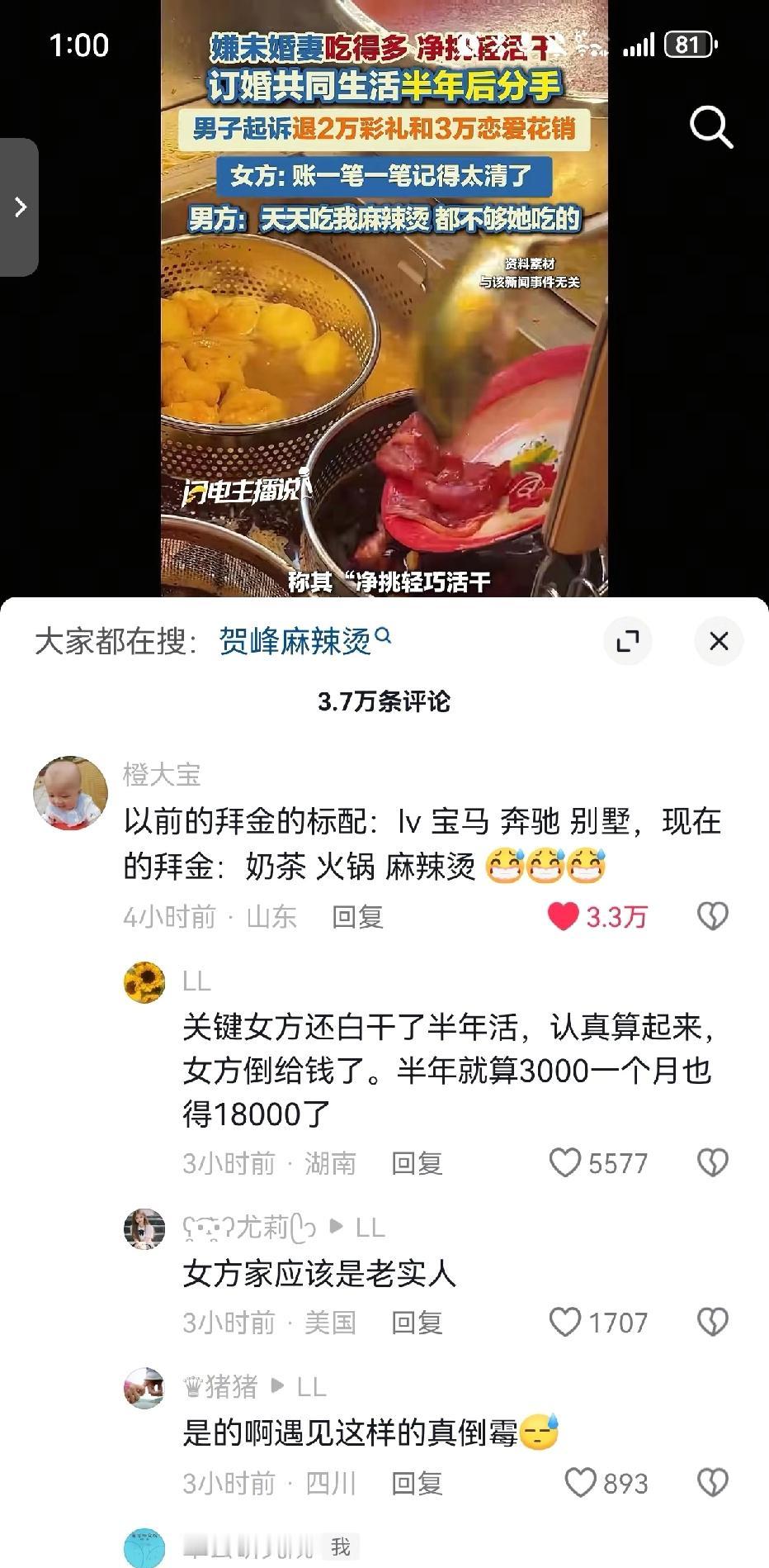 没想到你我也有拜金的一天…… 随着经济下行,消费降级,拜金标准持续降低,我也终于符合拜金女标准了,关键麻辣烫店是男的开的,女的打白工还嫌女的麻辣烫吃的多。