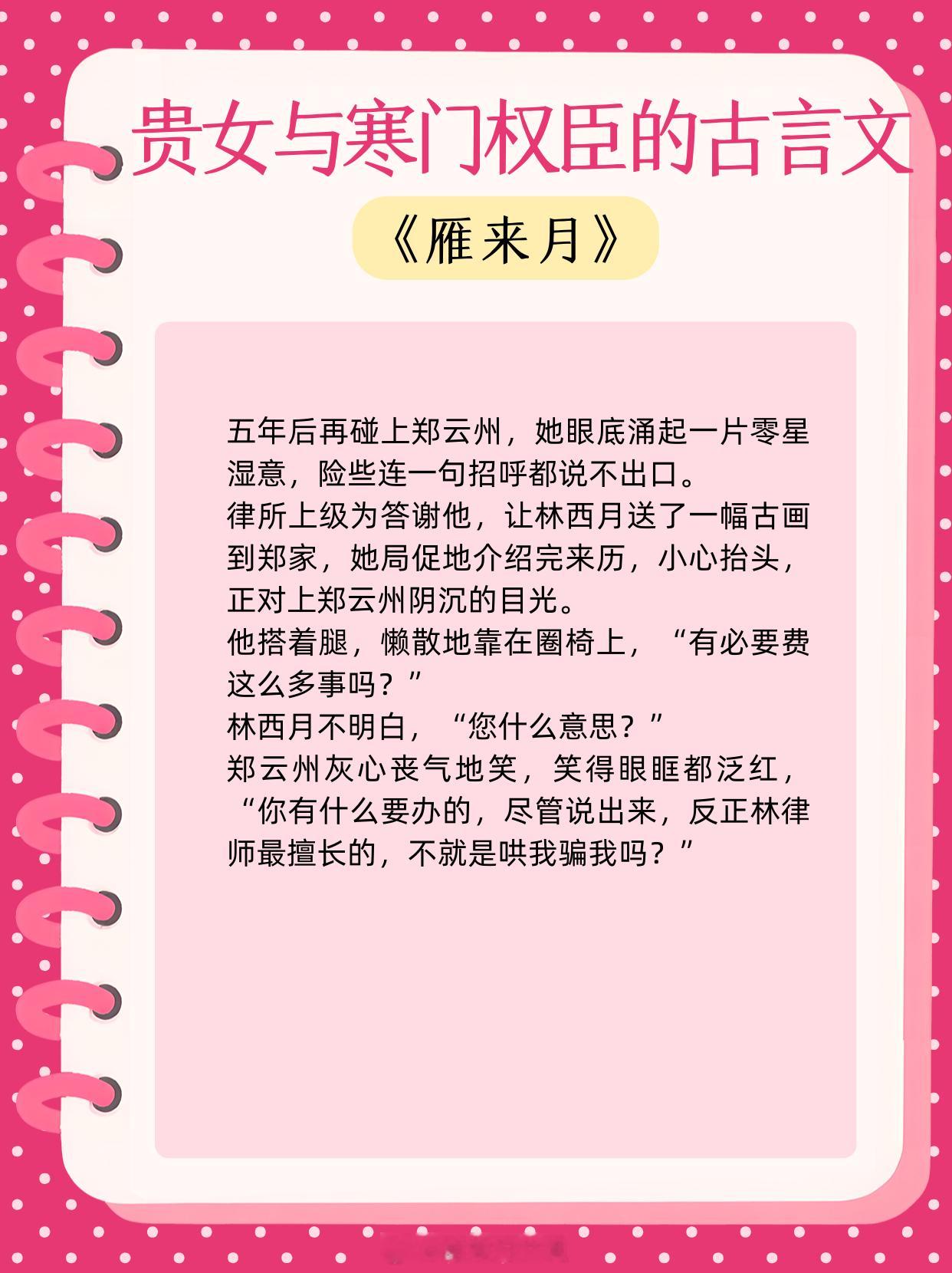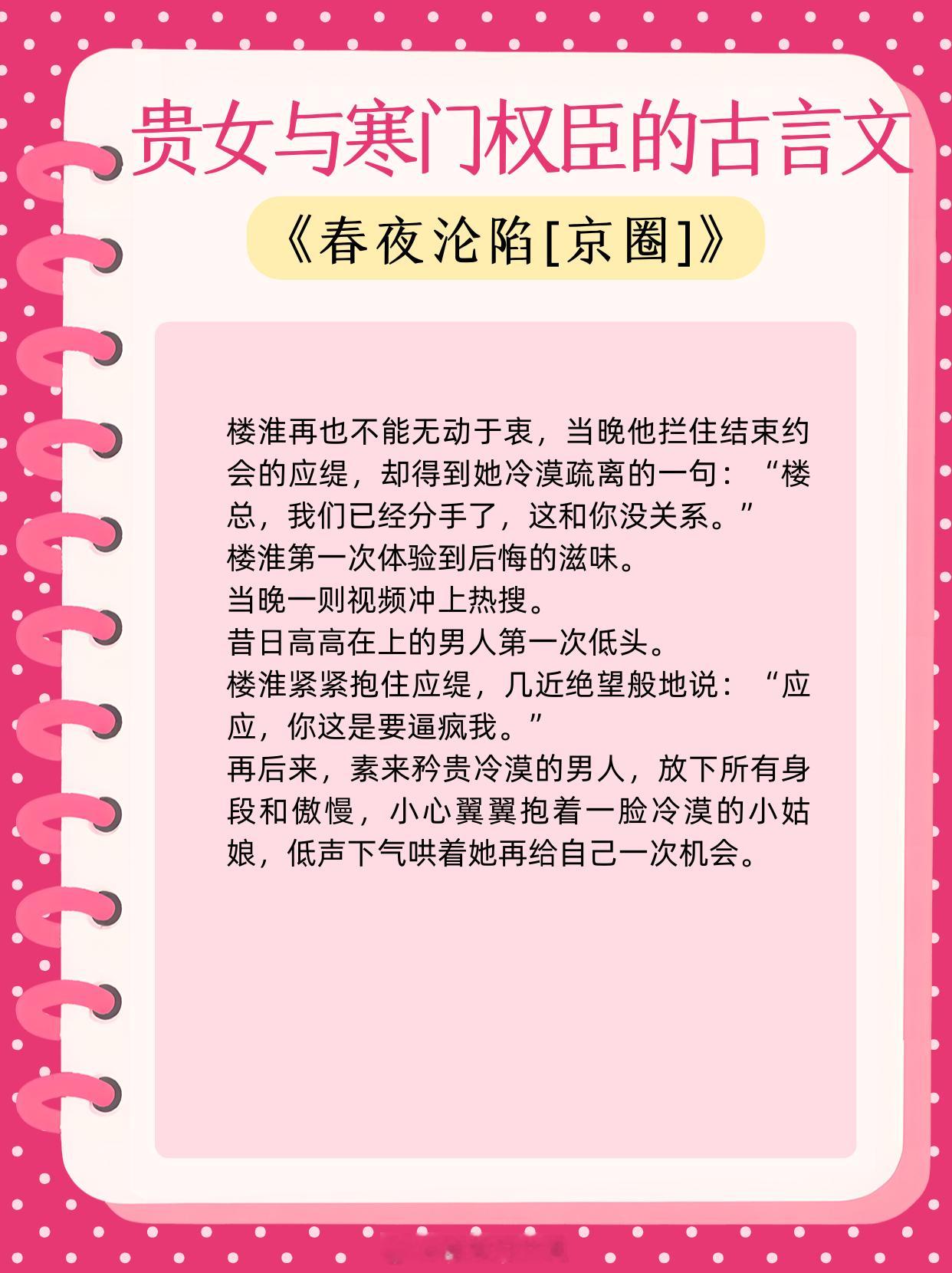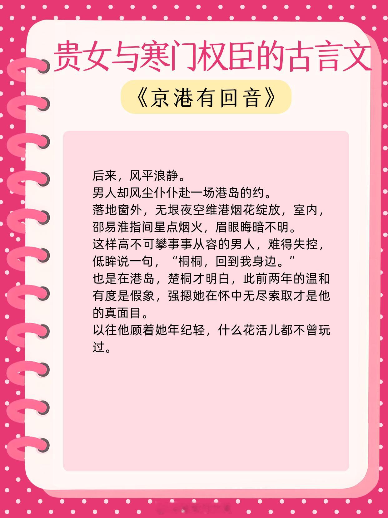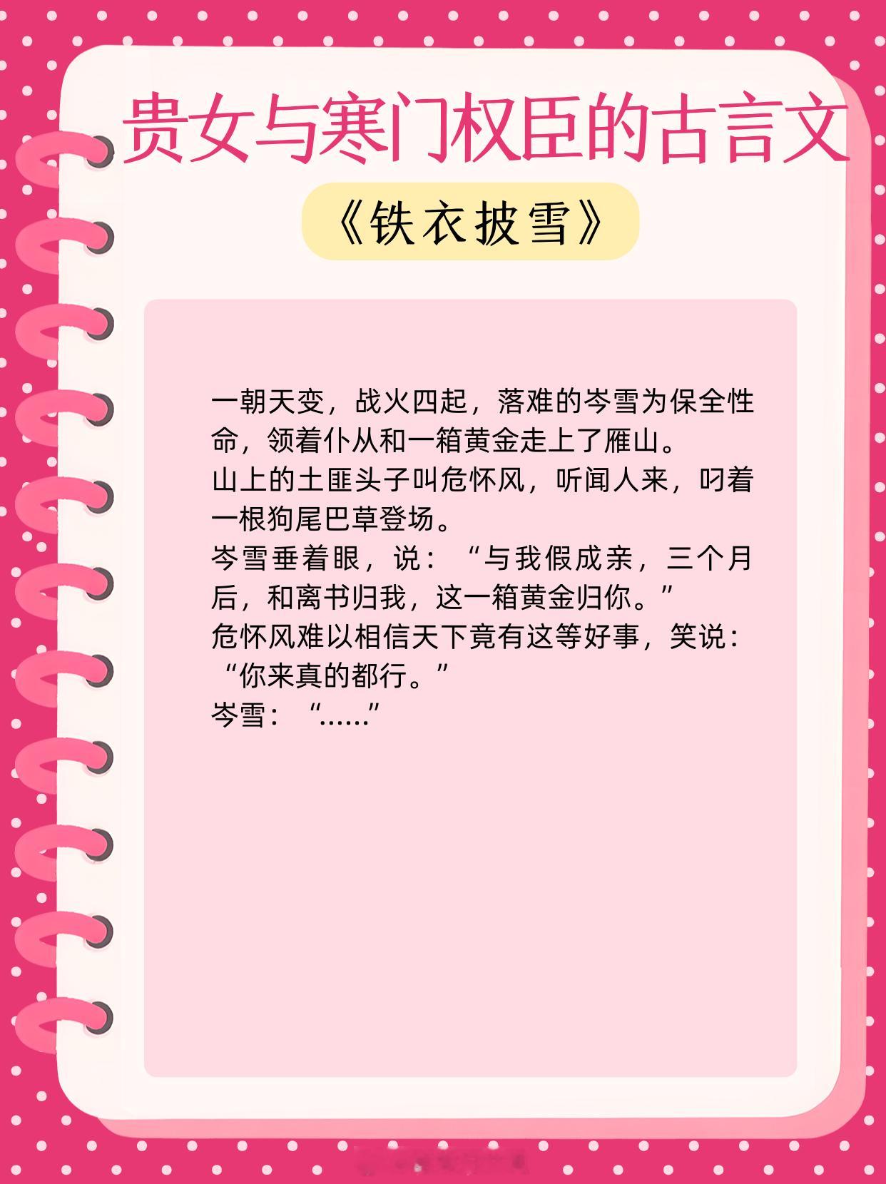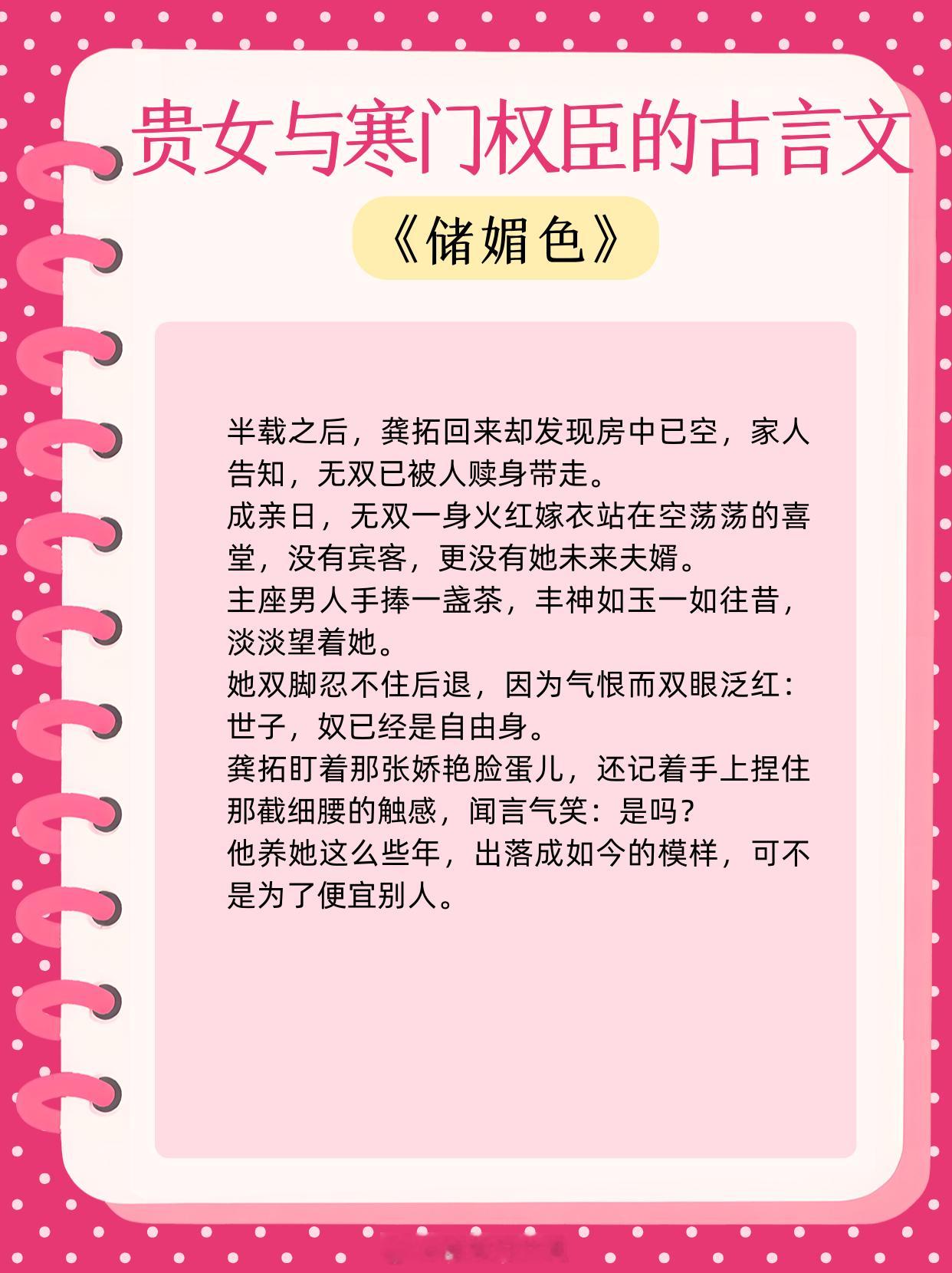 贵女与寒门权臣的古言文,我心归处,不过是你案头那盏茶。1、《他的暗卫》作者:女王不在家2、《鸾春》作者:希昀3、《储媚色》作者:望烟4、《京港有回音》作者:二川川5、《朕和她》作者:她与灯6、《春夜沦陷[京圈]》作者:俞览7、《雁来月》作者:一寸舟8、《庸俗童话》作者:七宝酥9、《铁衣披雪》作者:水怀珠这小说硬控我十分钟 让我吹爆的宝藏小说