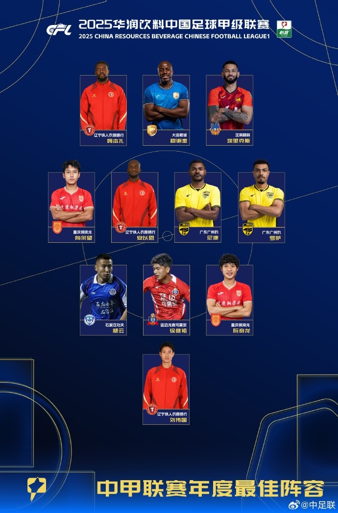 直播吧12月12日讯中足联颁奖典礼今晚进行,中甲最佳阵容方面,向余望、姆本扎、穆谢奎在列,辽宁铁人三人入围,铜梁龙、广州豹各两人。